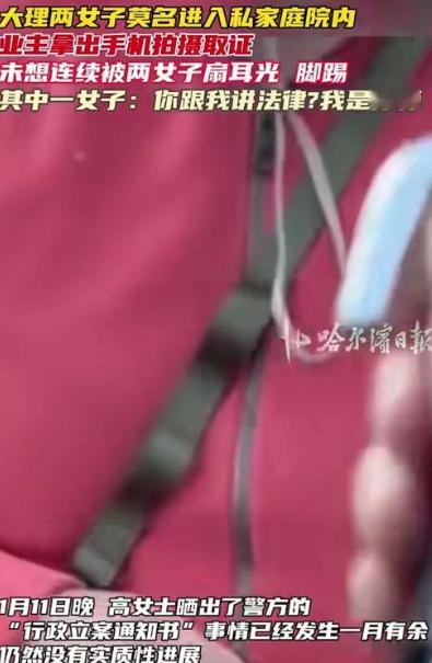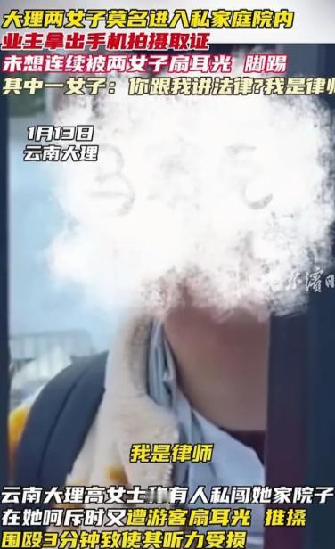 云南大理,两名女子去游玩,路过一家私人院子,看到里面很漂亮,就跑了进去,吓到了业主,业主拿出手机拍摄取证,不料被两名女子扇耳光,还被脚踢,业主足足被围殴了3分钟,业主跟她们讲法律,一个女子扬言道:你跟我讲法律,我是律师,我怕你跟我讲法律吗? 事情发生在白天,阳光正好。高女士家的院子位于一处相对安静的居民区,是她花了不少心思打理出来的。 院子里种着三角梅和多肉,墙角摆着几只陶罐,木质秋千在风里轻轻晃动,常有路过的游客忍不住驻足拍照。 当天,高女士正在院子里收拾杂物,打算给花草浇水,忽然听到院门被推开的声音。 她一抬头,发现有两名年轻女子已经走进了院子,一边四处张望,一边拿着手机拍照,嘴里还不停地感叹“这里好好看”“太出片了”。 高女士被吓了一跳,下意识地问了一句:“你们找谁?”两名女子似乎也愣了一下,但很快反应过来,其中一人笑着说:“我们路过,看着好看就进来看看。” 高女士当即表示不妥,她语气还算克制,说这是私人住宅,不是景点,也不是民宿,未经允许不能随便进入,请她们立刻离开。 原以为对方会道歉离开,没想到两名女子的态度却突然变了。她们不仅没有要走的意思,反而露出不屑的表情,其中一人嘀咕道:“这么凶干嘛,看一眼又不会少块肉。” 双方的语气逐渐升级,高女士强调这是自己的家,有明确的产权,擅自闯入已经构成侵权。两名女子却越说越冲,觉得自己只是“进去拍几张照”,高女士是在“小题大做”。 争执中,高女士担心事态失控,拿出手机开始录像,想留下证据。 正是这个举动,彻底激怒了对方。画面里可以看到,其中一名女子突然上前,一把拍掉高女士的手机,紧接着抬手就是一记耳光。 高女士完全没反应过来,整个人被打得踉跄了一下。还没等她站稳,另一名女子也冲了上来,对着她的脸和身体连续扇打、脚踢。 院子不大,高女士退无可退,只能一边护着头,一边大声呼救,反复喊着“这是我家”“你们不能打人”“我已经报警了”。 但两名女子情绪失控,轮番对她进行攻击,推搡、拉扯、扇耳光,甚至用脚踹她的腿和腰。整个过程持续了将近3分钟,高女士几乎被围在中间,毫无还手之力。 期间,高女士试图和对方讲道理,说打人是违法行为,会承担法律后果。 没想到,其中一名女子竟然冷笑着回应:“你跟我讲法律?我是律师,我怕你跟我讲法律吗?”这句话让高女士彻底寒了心,也让她意识到,对方根本没有任何悔意。 直到有邻居听到动静出来查看,两名女子才停止殴打,骂骂咧咧地离开了院子。高女士这才捡起被打落在地的手机,手一直在发抖。 事后,她发现自己脸部红肿,嘴角破皮,身上多处淤青,去医院检查后,医生建议她好好休养。 事后,高女士选择将监控和手机拍下的视频发到网上曝光。 她在视频里哽咽地说:“这是光天化日,我在自己家里,被陌生人闯进来,还被打成这样。我不是不让人拍照,但至少要尊重私人空间吧。” 视频发布后,很快引发网友热议。不少网友表示愤怒,认为擅闯私人住宅本身就不对,更不该动手打人;也有人质疑那名自称“律师”的女子,认为不管身份如何,法律面前人人平等。 更多网友则替高女士感到后怕,直言如果连在自己家里都无法保证安全,那实在太可怕了。 目前,高女士已经报警,相关部门也已介入调查。 她表示,自己曝光这件事,不是为了博关注,而是希望提醒大家:美景可以欣赏,但边界必须尊重,任何时候,暴力都不该成为解决问题的方式。