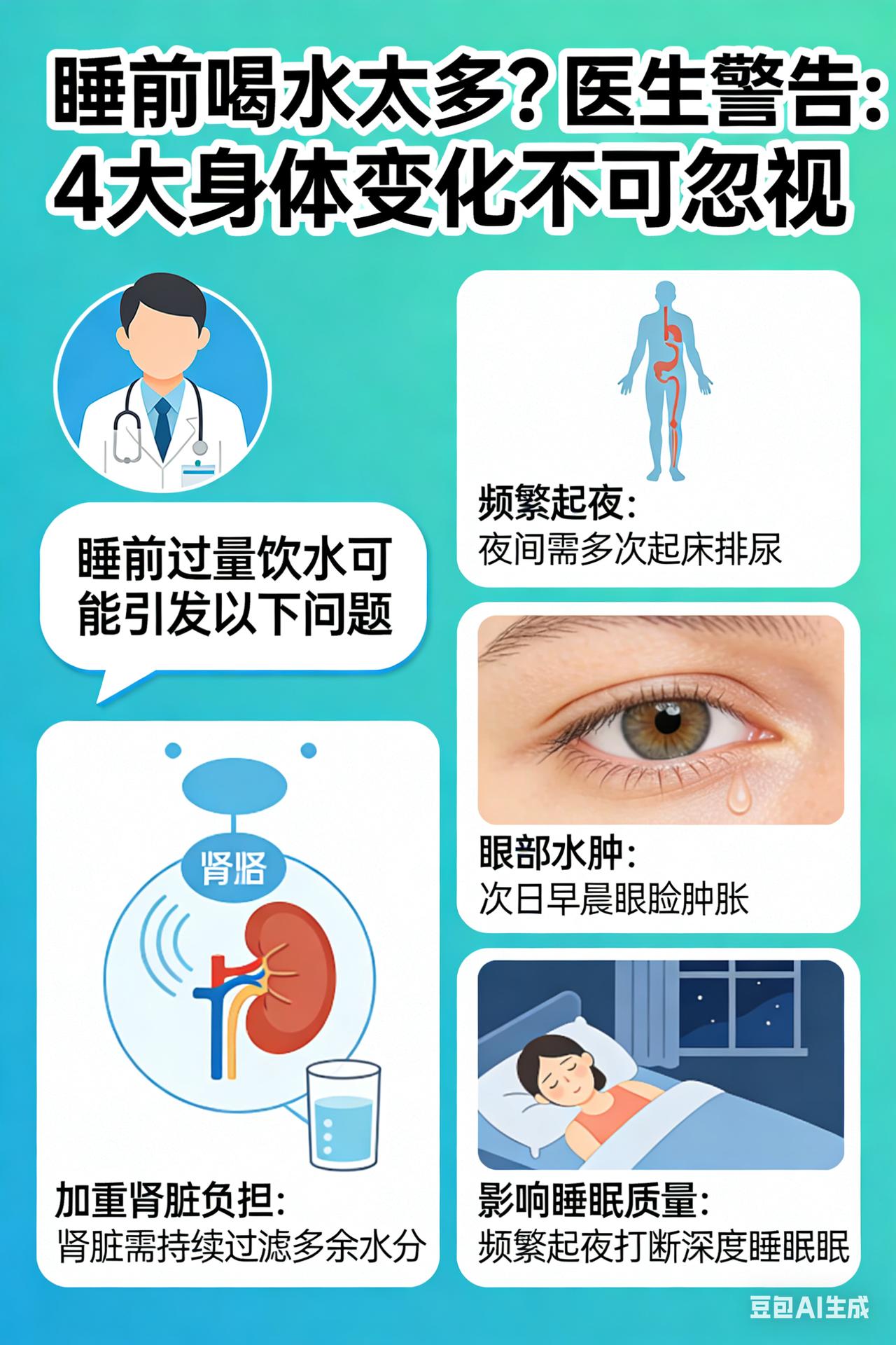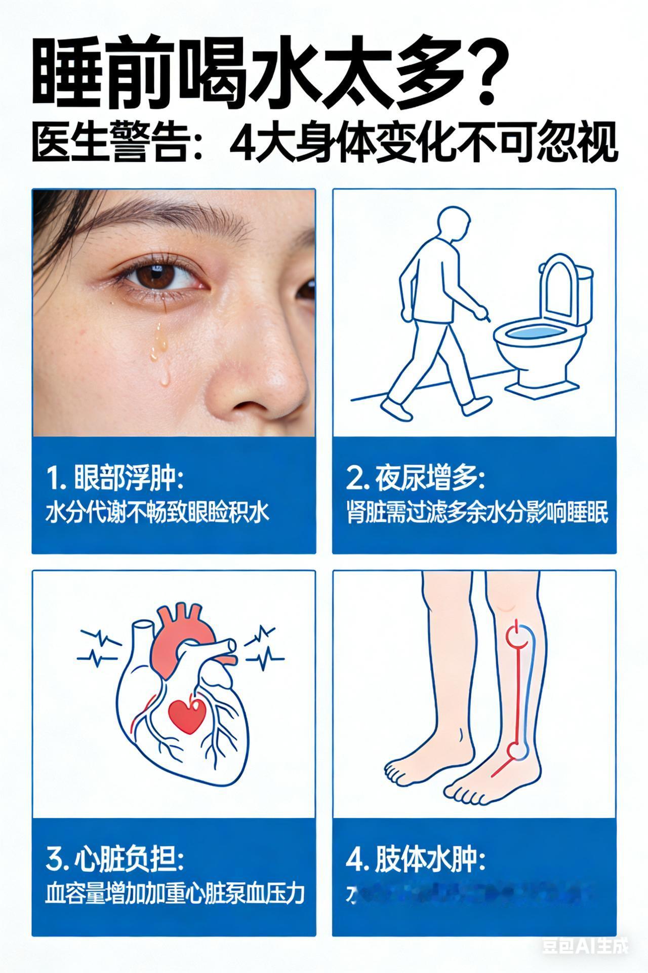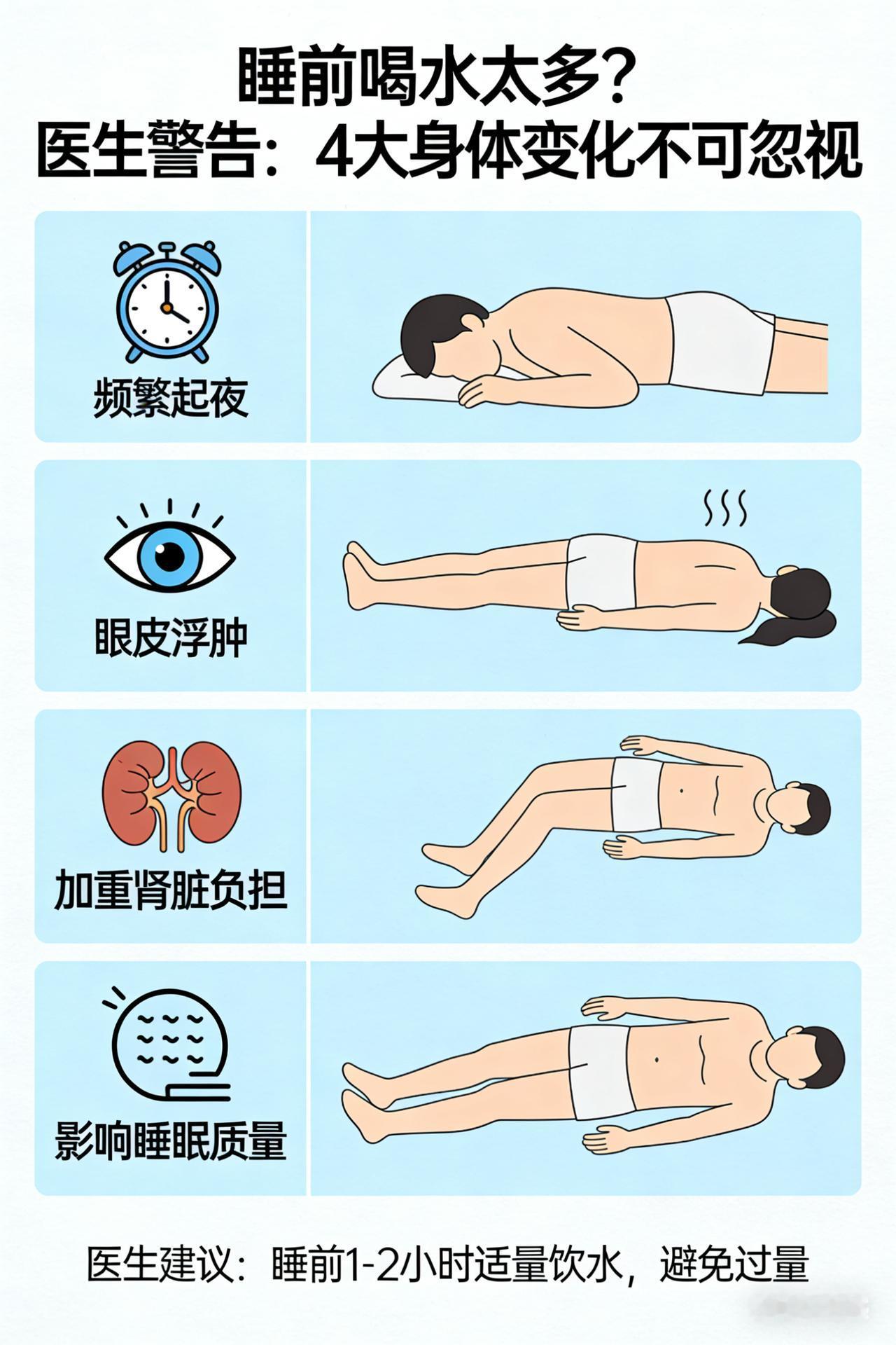 睡前喝水太多?医生警告:4 大身体变化不可忽视 哈佛惊爆发现:睡前豪饮,数月后身体或遭4大“灭顶之灾”! 在追求健康养生的漫漫征途中,我们总是不遗余力地探寻各种看似有益的习惯,睡前喝上一大杯水,便是许多人笃信不疑的“健康秘籍”,觉得这样既能给身体“解渴”,又能促进新陈代谢,让身体焕发出勃勃生机。然而,哈佛大学公共健康学院一项具有划时代意义的重磅研究,却如同一颗投入平静湖面的巨石,激起了千层浪,彻底颠覆了我们以往对睡前饮水的认知。该研究对1.5万人进行了长达6个月的深度追踪,结果令人瞠目结舌、后背发凉:睡前每次饮水量达到或超过350毫升的人群,超过四成在短短2个月内就出现了不同程度的健康问题。这一惊人的发现,无疑为我们敲响了健康警钟,让我们不得不重新审视睡前饮水 夜晚,本应是身心彻底放松、悠然沉浸于酣甜美梦的绝佳时刻。想象一下,你正悠然自得地穿梭在五彩斑斓、如梦如幻的梦境之中,与仙女翩翩起舞,和精灵嬉戏玩耍,仿佛置身于一个世外桃源般的仙境。然而,突然间,一阵如汹涌潮水般袭来的强烈尿意,如同一记重锤,瞬间将你从美梦中狠狠拉回残酷的现实。那种被生生打断睡眠的痛苦,就像被人从温暖的被窝里硬生生拽出来,丢进了冰天雪地之中,简直让人苦不堪言、抓狂不已。 睡前大量喝水,膀胱就像一个被不断注水的气球,迅速膨胀起来,无情地压迫着周围的神经和组织,仿佛在发出痛苦的呻吟。这直接导致夜间频繁起夜,深度睡眠被一次次无情地打断,如同美妙的乐章中突然插入刺耳的噪音。哈佛大学流行病学数据显示,这类人群夜间醒来的次数平均增加了69%,深度睡眠时间大幅缩短,最高可达40%。长期处于这样的状态,第二天你会感觉精神萎靡不振,仿佛被抽走了灵魂,哈欠连天,注意力难以集中,工作效率如同坐滑梯般直线下降。更可怕的是,还可能引发睡眠紊乱综合征,让你的夜晚不再有宁静的睡眠,白天也被疲惫和困倦紧紧缠绕,生活陷入无尽的恶性循环,仿佛陷入了一个无法挣脱的黑暗漩涡。 肾脏,作为我们身体的“净化工厂”,默默地承担着过滤血液、排除废物的重要使命。它就像一位忠诚无比的守护者,日夜不停地为我们守护着身体的健康防线,不辞辛劳,毫无怨言。夜间,本是肾脏的“休养生息”时段,它可以进行自我修复和调整,为第二天的工作养精蓄锐,就像一位战士在战斗间隙进行短暂的休整,以便更好地迎接新的挑战。 然而,睡前大量饮水却如同一场突如其来的狂风暴雨,打破了这份宁静与和谐。肾脏被迫超负荷运转,就像一位疲惫不堪的战士,在战场上连续奋战数小时,却得不到片刻的喘息。研究发现,在50岁以上的参与者中,超过七成出现了晨起面部或下肢浮肿的情况,尿蛋白定量也有轻度升高。这表明肾脏的滤过功能已经受到了轻微损伤,如同精密仪器上的一个小零件出现了故障,虽然看似微不足道,但却可能引发一系列严重的后果。如果不及时调整,肾脏可能会逐渐失去“战斗力”,引发更严重的肾脏疾病,如肾炎、肾衰竭等,让我们的健康岌岌可危,仿佛一座大厦即将崩塌。 心脏,是我们身体的“发动机”,它如同一个不知疲倦的鼓手,源源不断地为全身输送血液和氧气,维持着身体的正常运转,让我们的生命之花得以绚烂绽放。睡前大量喝水会导致血容量在短时间内急剧增加,心脏就像一个被过度充气的气球,承受着巨大的压力,仿佛随时都会爆炸。对于高血压、心力衰竭等基础疾病患者来说,这种风险更是成倍增加,如同在悬崖边上行走,稍有不慎就会坠入万丈深渊,粉身碎骨。 曾经有一位68岁的张大爷,因为睡前喜欢喝浓茶,结果夜间突发胸闷气喘,仿佛有一块大石头压在胸口,让他喘不过气来。家人紧急将他送往医院,诊断为急性心衰发作。而罪魁祸首,正是睡前过量饮水。这一惨痛的案例为我们敲响了警钟,提醒我们睡前大量饮水对心血管系统的潜在危害不容小觑,就像一颗隐藏在身边的定时炸弹,随时可能爆炸,给我们带来灭顶之灾。 电解质,是我们身体维持正常生理功能的重要物质,如钠、钾等,它们就像一群默契的舞者,在身体的舞台上和谐共舞,维持着身体的平衡与稳定,让我们的身体能够正常运转。短时间内摄入大量水分,会像一场突如其来的“洪水”一样,无情地稀释血液中的电解质,打破这种和谐与稳定,引发低钠血症。患者会出现头晕、呕吐、肌肉抽搐等症状,严重时甚至可能诱发意识模糊,危及生命。这就好比一个精密的仪器,其中的某个零件突然出现了故障,导致整个仪器无法正常运行,陷入混乱失控的状态,发出刺耳的噪音,让人心烦意乱。 哈佛团队建议,睡前饮水应控制在100毫升以内,以不产生明显尿意为标准。健康饮水,关键在于“精准时间、精准量、精准方式”,切勿盲目跟风,以免给身体带来不必要的负担。让我们从现在开始,重新审视自己的睡前饮水习惯,用科学的方式守护好我们的身体健康,让生命之花在健康的土壤中绽放出更加绚烂的光彩。