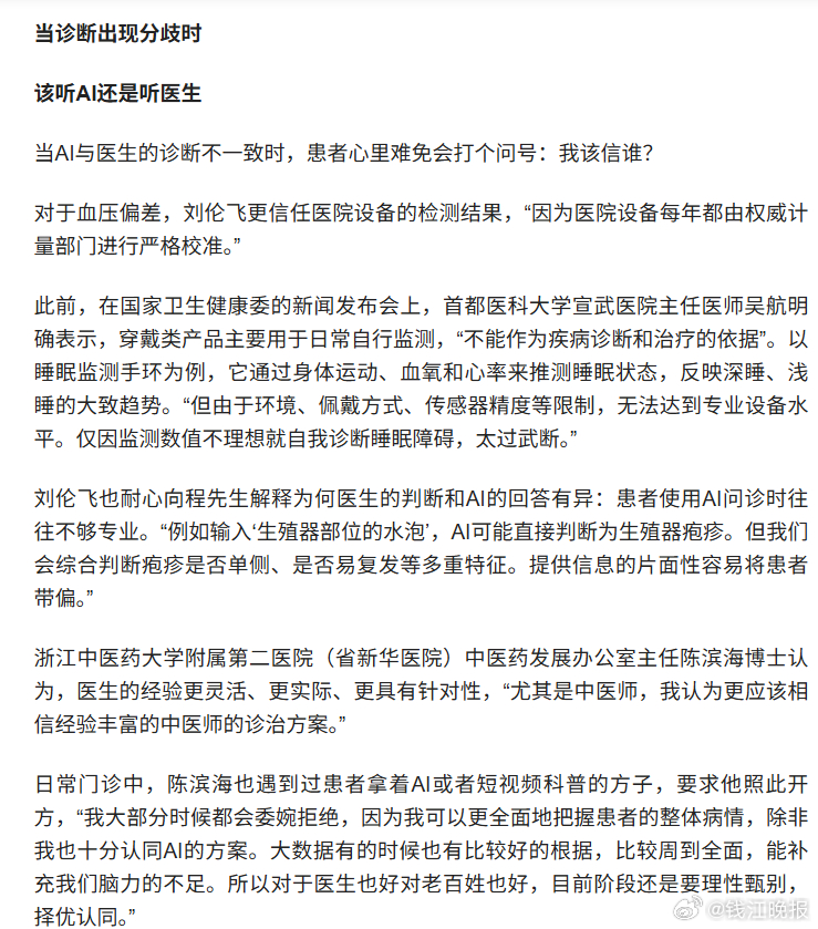 【该听AI还是听医生?#男子被AI诊断梅毒医生否认却不信#】被认定为梅毒,30岁的程先生不淡定了,之后反复就医,无法释怀。浙江大学医学院附属第四医院皮肤科主任、主任医师告诉记者,“我看了后认为就只是普通的皮肤问题,但他执拗地告诉我,AI判断是梅毒类疾病。”