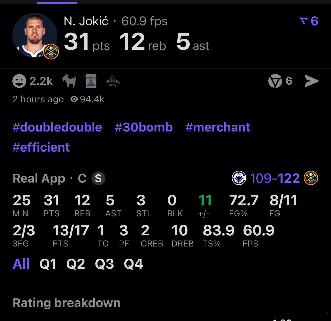 篮球第一人今天火线复出!约基奇出战24分钟,11投8中,其中三分球3投2中,罚球17投13中,得到31分12篮板5助攻3抢断。