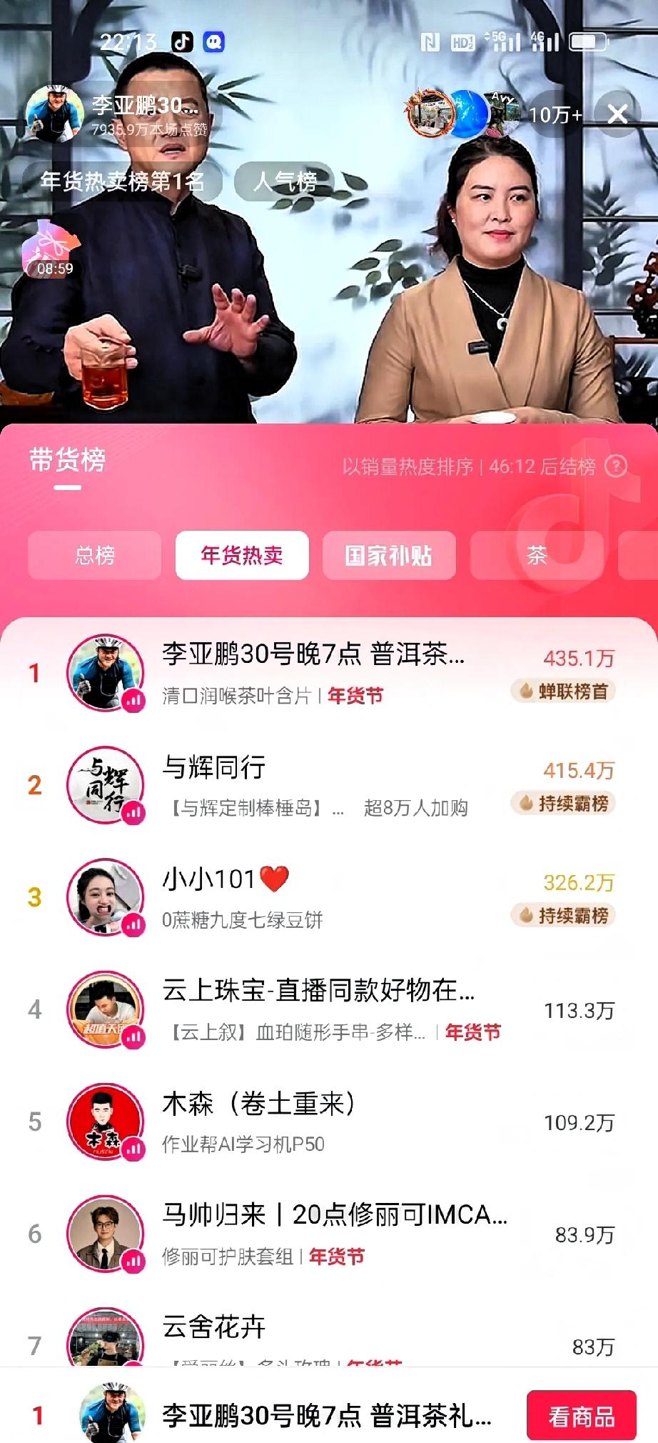 李亚鹏2026年1月30日晚上7点开始直播,连续直播6小时,有2970万人进入直
