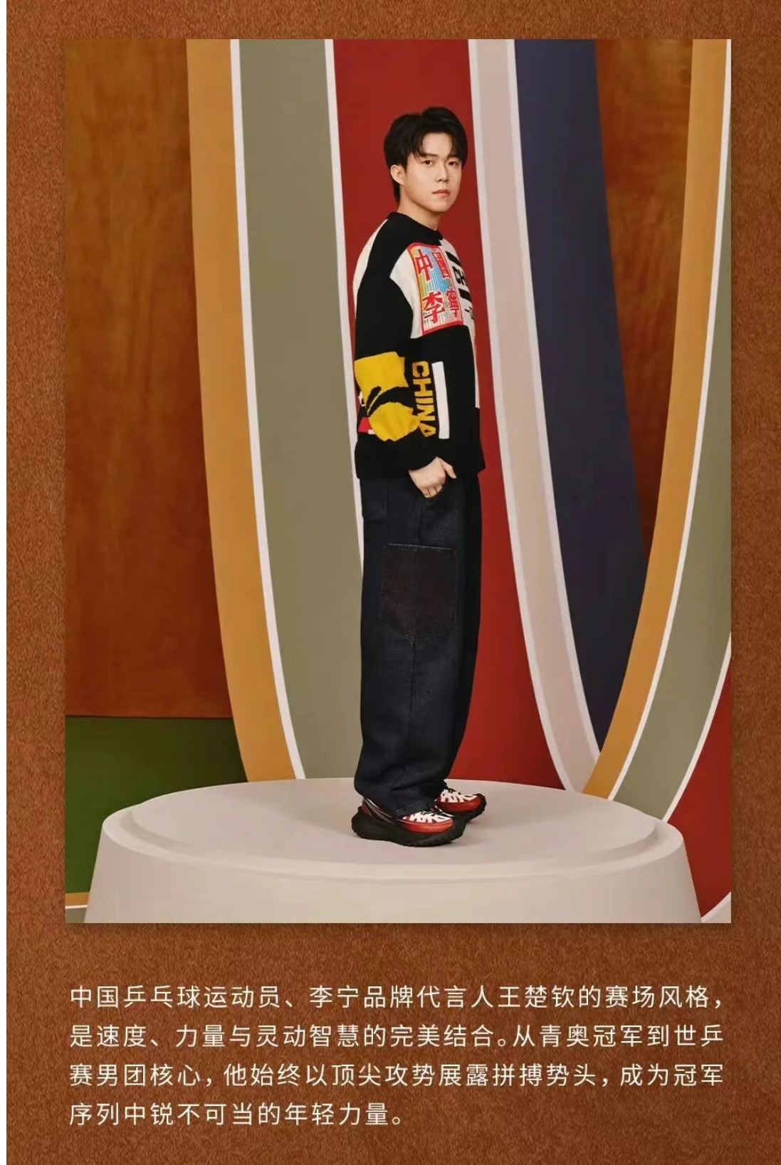 “夺得世锦赛金满贯的王楚钦,将乒乓竞技精神融入日常步伐,于复古质感中透出现代活力。”
