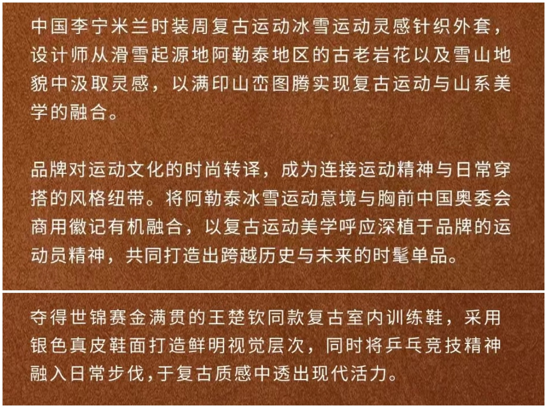 “王楚钦的胜者叙事,在米兰找到新的表达。不同重任间自如切换的掌控力,是他驾驭先锋时装的从容底气。他自持锐意进取的热血精神,也被转译为极具胜利意义的秀场服饰设计,指向每个人内心"向峰而行"的运动员姿态。”