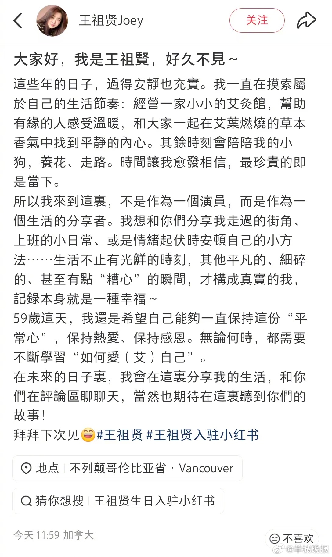 【#王祖贤晒素颜照片#】息影21年的王祖贤于2026年1月31日中午12时左右,突然在社交平台发了一张素颜图片,并配发一段文字,分享了这些年自己的工作、生活心得感悟,她写道:“这些年的日子,过得安静且充实……59岁的今天,我还是希望自己一直能保持这份平常心。”素颜照片和暖心文字问候,1小时内圈粉无数,关注数1.5万,点赞数近2万,留言2000多条,掀起全网跨越代际的怀旧狂欢。([原创]记者:黎秋玲;编辑:郑宗敏;审签:周乐瑞)