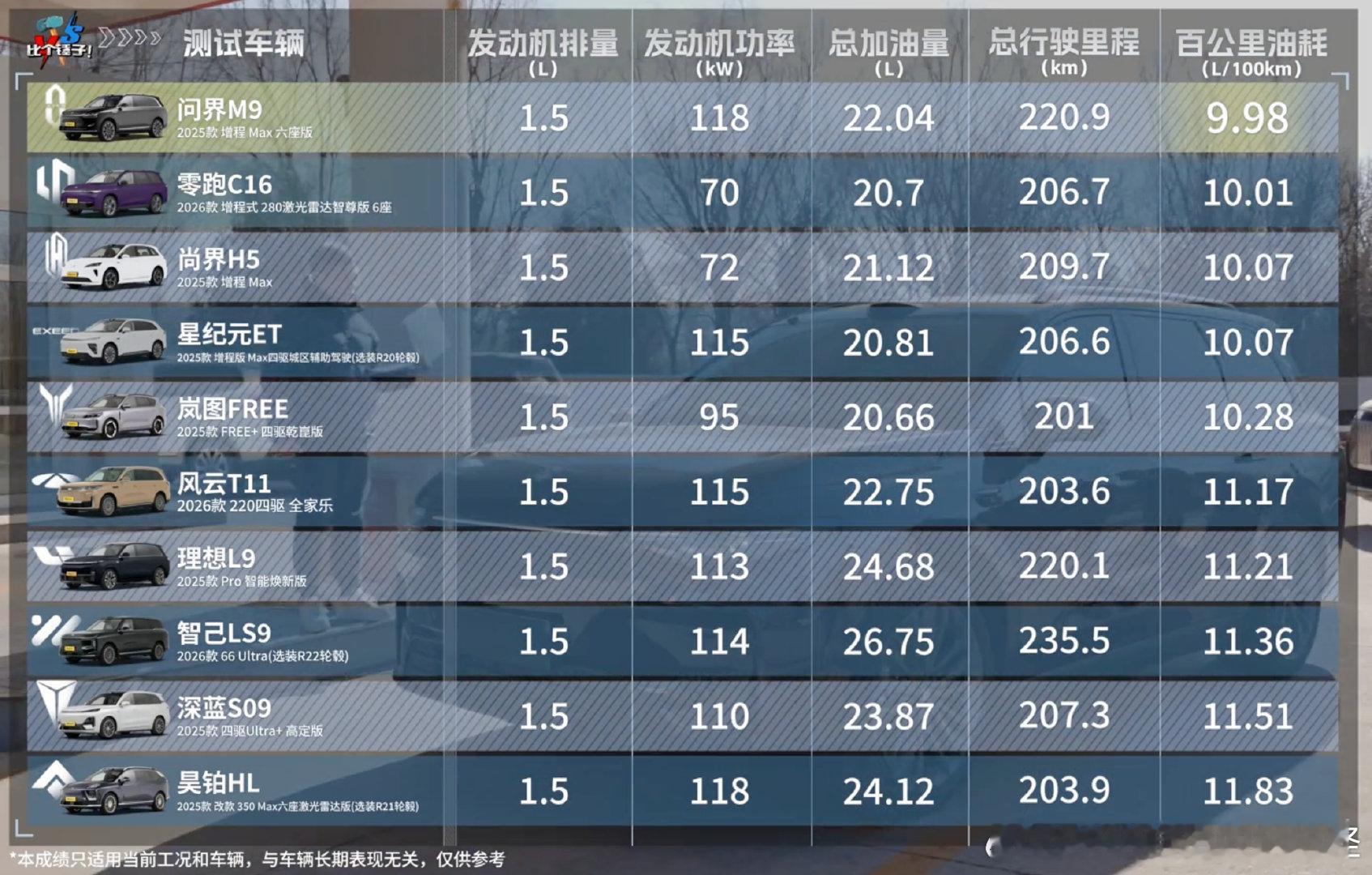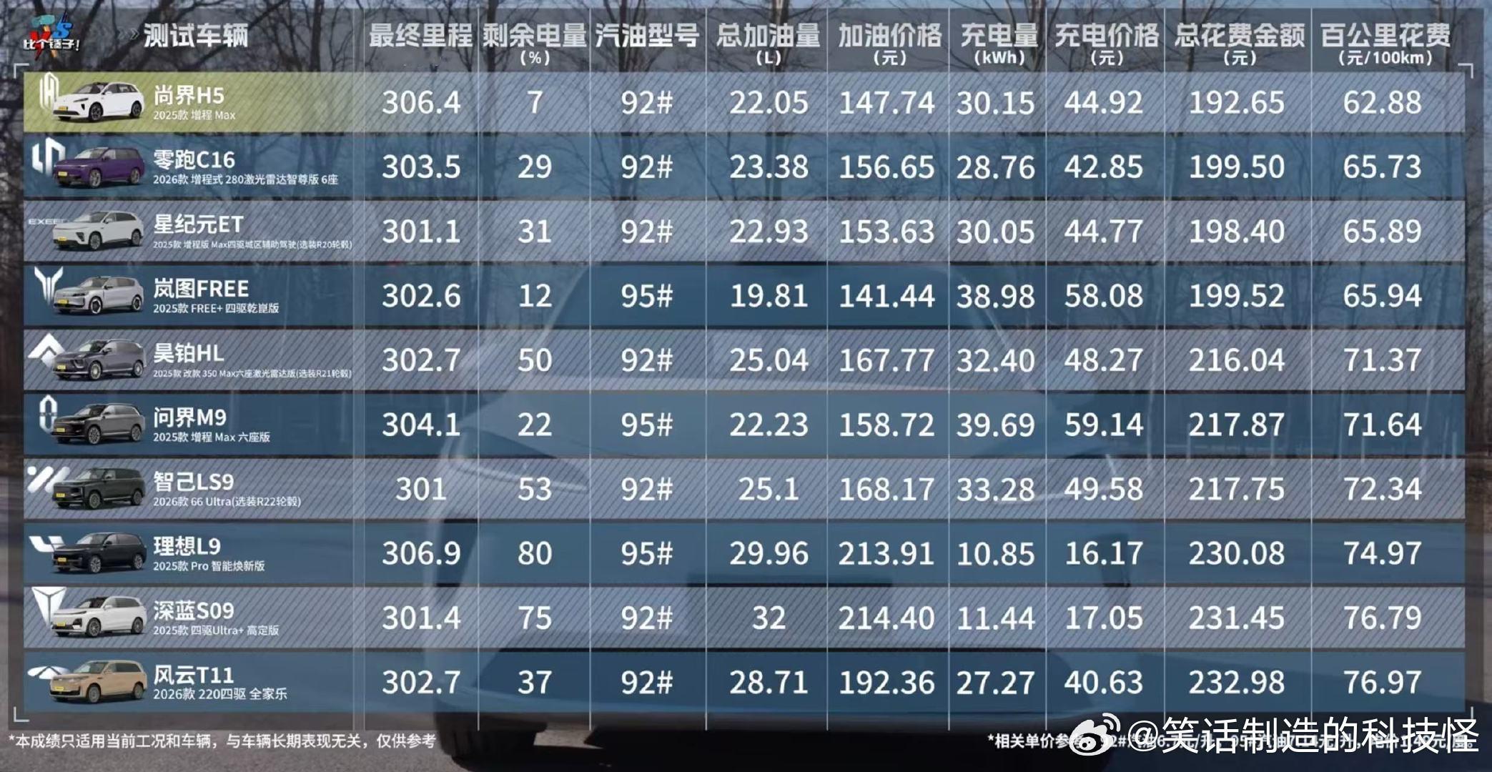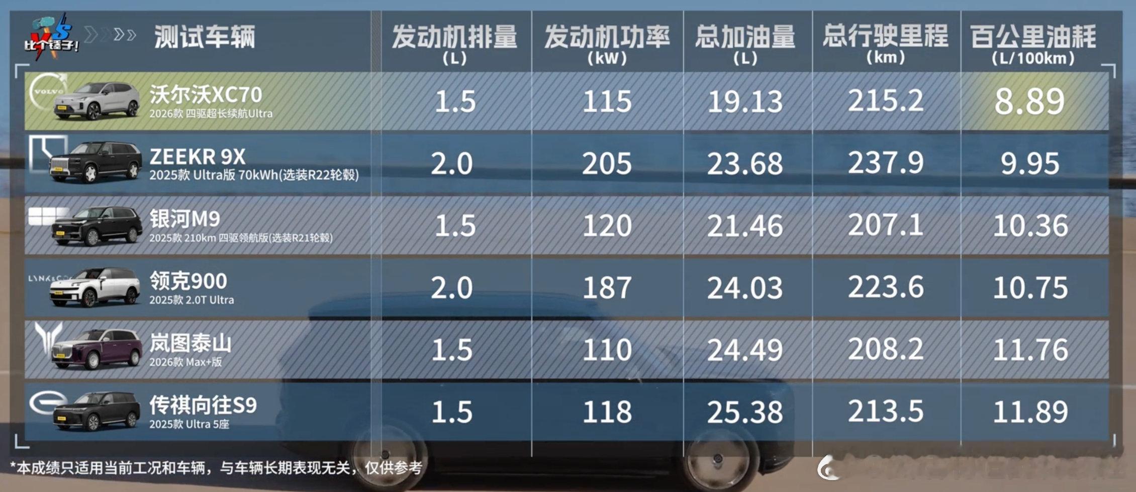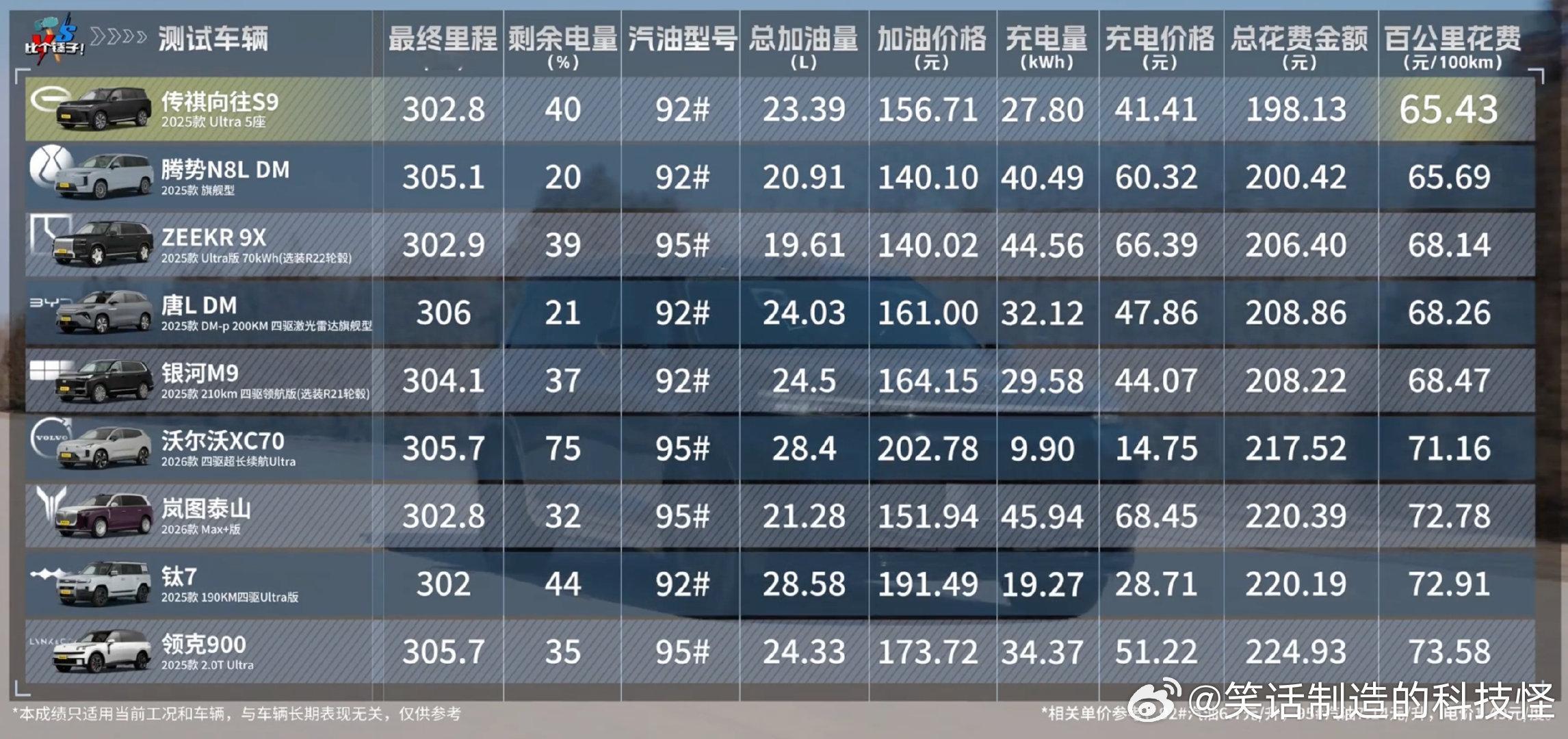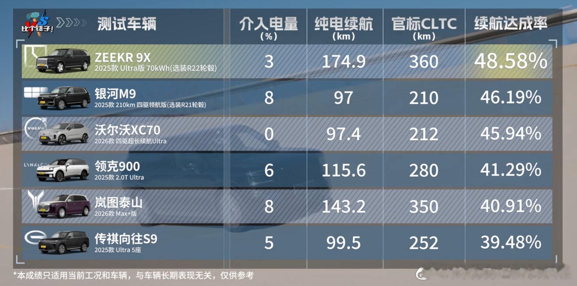 刚看完懂车帝独播的混动高速纯电续航测试,信息量挺大。这次把所有车都切成强制纯电模式跑到发动机介入,测得很极限。插混组表现整体更优,极氪9X靠着70度电池跑出174.9公里,续航达成率接近50%;吉利银河M9也体现出了电控系统在高速下的优化能力。沃尔沃XC70、领克900和岚图泰山组成第二梯队,达成率都在40%-46%之间!增程车型这边,深蓝S09以42.43%的达成率成为黑马,虽然零跑C16保电策略非常保守,但也是十台车当中增程器介入时剩余电量最多的一台车了,剩余12%电量的时候自己就强制介入了,这样保守的保电策略让他在后面的亏电环节当中也发挥出了油耗低的优势。整体来看,大电池混动车型即使高速工况下,纯电续航依然具备实用价值,城区通勤完全可以当作纯电车来用!建议大家去懂车帝搜“混动续航”,视频和完整榜单都有,这次媒体的真实测试把各车型的高速纯电续航、馈电油耗、百公里能耗成本都测明白了,数据在懂车帝都是独家上线的,参考性很强。如果你也好奇自己关注的混动车到底能跑多远、能耗怎么样,选车之前看一眼,心里更有数。懂车帝独播 混动车极限续航(