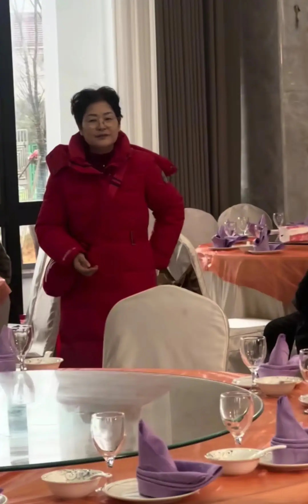 林青霞现身酒店参加朋友的喜酒,她染了棕发,面色红润,她穿着大红色上衣,挽着发髻,