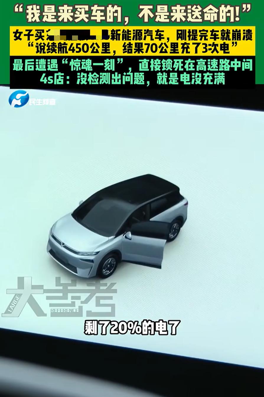 “我快吓死了!”河南郑州,女子买了一台新能源汽车,提车当天,喜滋滋的到店里,把电量充到97%后就准备上高速回家,万万没想到,说好的续航450公里,结果仅跑了70公里就冲了3次电,甚至还在高速上趴窝,女子彻底破防了:我是来买车的,不是来送命的! 河南郑州,一名女子满心欢喜入手一台新能源汽车,本以为能开启便捷出行,没曾想提车当天就遭遇惊魂一幕, 原本宣传的450公里续航,实际跑了70公里就被迫充了3次电,最后直接在高速上趴窝,女子崩溃直言“我是来买车的,不是来送命的”,这份提车喜悦瞬间被恐惧和愤怒取代。 女子筹备许久,最终敲定一台新能源汽车,全程按流程办理手续,提车当天特意提前赶到门店,等着给新车充满电再开回家。 在店员的协助下,新车电量被充至97%,此时仪表盘也显示剩余续航贴合450公里的宣传标准,女子喜滋滋地出发,规划着走高速快速返程,压根没多想续航会出问题。 驶上高速后没多久,女子就发现不对劲——仪表盘上的电量掉得飞快,和平时了解到的续航表现完全不符,原本以为是新车磨合期的正常现象,没太在意, 可没过多久,电量预警就频频响起,迫使她不得不就近寻找高速服务区充电。短短一段路程,她先后三次驶入服务区充电,每次都要耽误许久,原本顺畅的返程路变得格外折腾。 更让女子心惊的是,第三次充电后没跑多远,车辆突然失去动力,直接在高速车道上趴窝,当时高速上车流量不小,后方车辆纷纷紧急避让,场面十分危险。 女子吓得浑身发凉,赶紧按照安全规范开启双闪,在车后150米处放置警示标志,之后匆忙撤离到应急车道,回想起来仍心有余悸,直言“我快吓死了”。 要知道,新能源车高速趴窝暗藏极大安全隐患,此前就有因车辆电量耗尽,驾驶员下车推车被货车追尾致2人死亡的悲剧发生,女子此次能安全撤离,已然是万幸。 冷静下来后,女子彻底破防,自己花真金白银买新车,图的是便捷安全,可如今续航严重缩水,还差点引发交通事故,这份落差让她难以接受。 女子第一时间联系购车门店,反映车辆续航严重不符及高速趴窝的问题,可门店给出的回应十分敷衍,要么称是电池未校准、充的是虚电, 要么表示没检测出问题,仅建议她再次充满电磨合观察,并未给出实质性的解决方案,也没有提及赔偿或退换车事宜。 此事被女子曝光后,引发不少新能源车主的共鸣,有车主坦言也曾遇到过续航虚标的问题,尤其是高速行驶时,续航缩水更为明显。 目前,女子仍在与门店协商处理此事,同时也留存了相关证据,准备通过合法途径维护自身权益。业内人士提醒,消费者购买新能源车时,应重点关注极端条件下的实测续航,同时留存好宣传资料,避免遭遇续航虚标陷阱。 一场满心欢喜的提车,最终变成惊魂记,续航虚标不仅消耗消费者信任,更关乎行车安全。对此,你们有什么看法,欢迎评论留言~