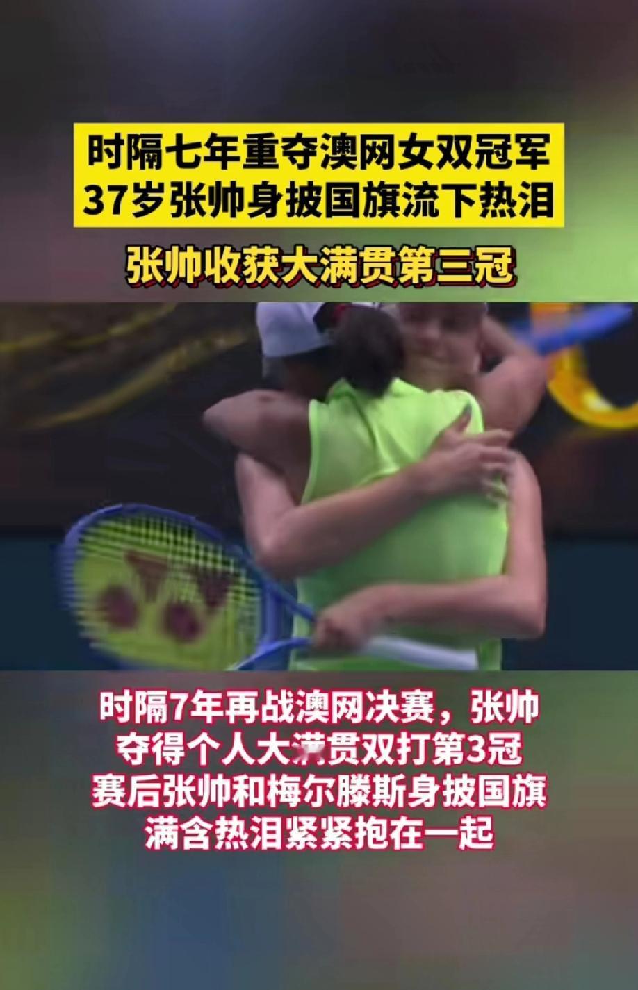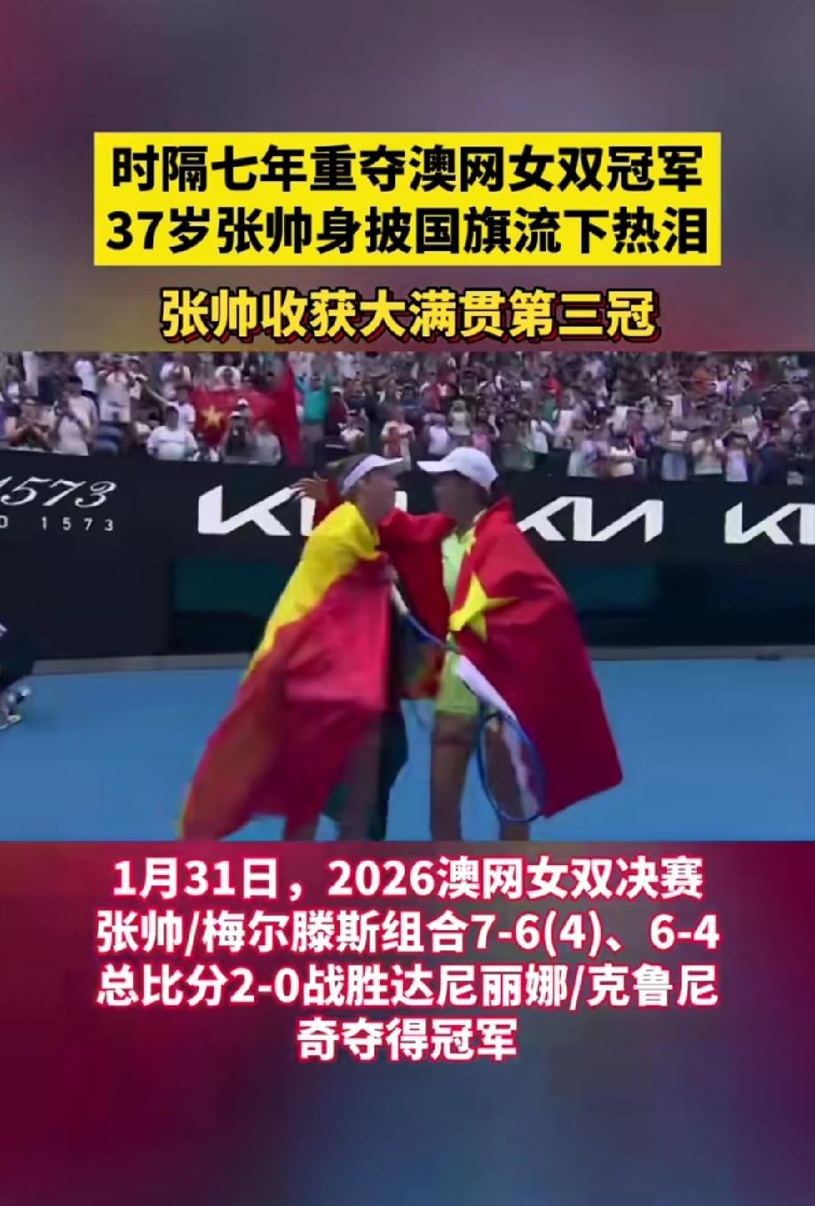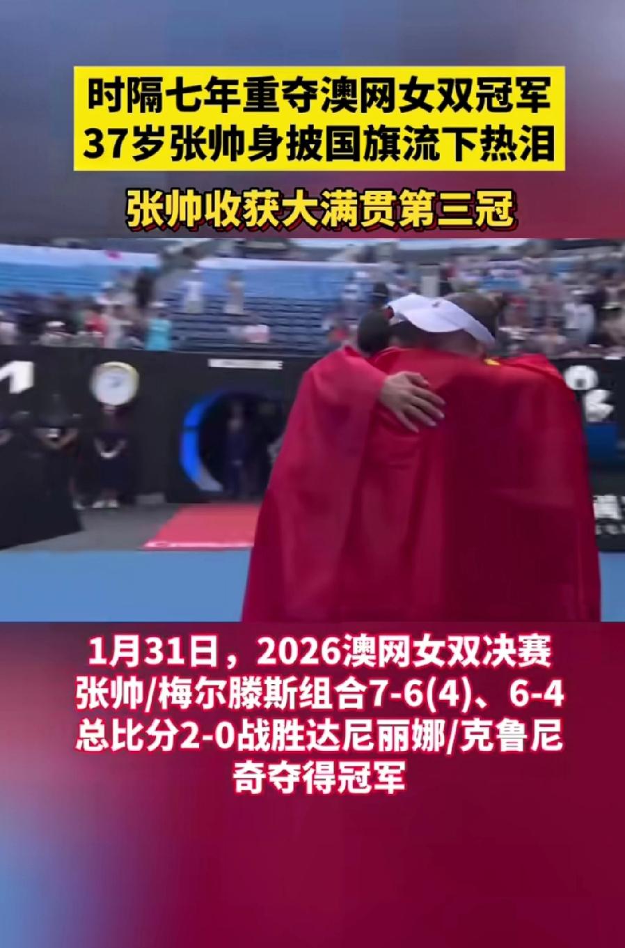 大满贯第3冠!张帅组合澳网女双夺冠 当墨尔本罗德·拉沃尔球场的冠军奖杯被高高举起,当鲜艳的五星红旗披在37岁的张帅肩头,泪水混着汗水滑落的瞬间,全网都为这位中国金花沸腾了!7-6(4)、6-4,逆转取胜的比分背后,是老将不死的倔强,是跨越年龄的坚守,更是刻在骨子里的永不言弃。 谁能想到,这场夺冠之战,张帅组合开局就陷入1-4的绝境,对手的凌厉进攻几乎压得人喘不过气;谁又能料到,在第二盘5-0手握赛点时,对手连追4局将悬念拉满。可偏偏是张帅,这个早已过了网球黄金年龄的老将,用沉稳的底线相持稳住阵脚,用72%的网前得分率撕开防线,每一次挥拍都带着破釜沉舟的勇气,每一次救球都藏着绝不认输的韧劲。 这不是张帅第一次上演逆风翻盘。本届澳网,她三线作战,女单折戟后便全心投入双打,第二轮0-5落后连赢7局、决胜盘挽救3个赛点,四强战丢首盘后让一追二,一路跌跌撞撞,却始终向着冠军前行。有人说,37岁的她早该退役享清福,可只有她自己知道,对网球的热爱,对国旗升起的渴望,能抵过所有的伤病与疲惫。 赛场从不是年轻人的独角戏,年龄更不是梦想的休止符。张帅的三冠传奇,让我们看到了坚持的意义:那些熬过来的至暗时刻,那些拼尽全力的瞬间,终会化作照亮前路的光。她曾经历大满贯14连败的低谷,也曾漂泊海外熬过无数孤独的训练日,可她从未低头,用二十年的坚守,接过郑洁手中的火炬,续写着中国网球的荣光。 当梅尔滕斯说“张帅的坚韧感染了我”,当张帅哽咽着说“37岁站在领奖台,是对自己最好的奖赏”,我们终于明白,真正的强者,从不是战胜对手,而是一次次战胜那个想要放弃的自己。 这抹在墨尔本飘扬的中国红,是张帅的荣光,更是所有追梦者的榜样。致敬37岁的张帅,致敬每一个在平凡生活中咬牙坚持的我们!你是否也被张帅的坚持打动?说说你心中最让你热泪盈眶的瞬间!