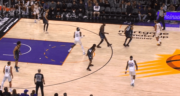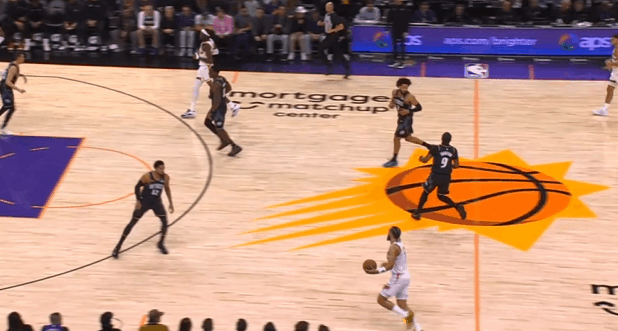 P4狄龙持球推进遭遇CC全场领防施压,中线附近直接发动和马威在边路的挡拆:将CC摆脱在身后,随即炸球衔接推球变向走Z字形向右路行进。面对换防过来的杜伦,炸球一二步急停直接拔起出手后仰跳投,命中。