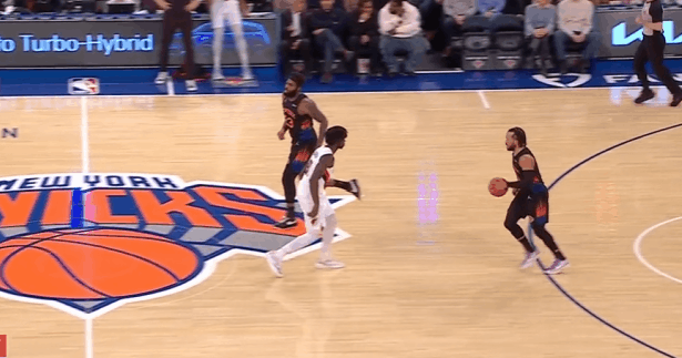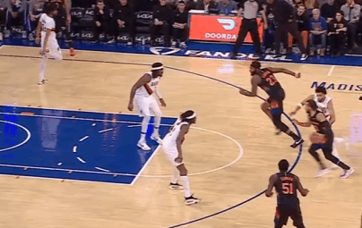 P3布伦森无球起手执行“WTF”战术,兜至弧顶接球后顺势启动突破。行进至罚球线位置主动发力寻找对抗,随后立即跳步急停起抛投终结,顶着卡马拉强干扰放进篮筐。慢动作细节呈现:P4