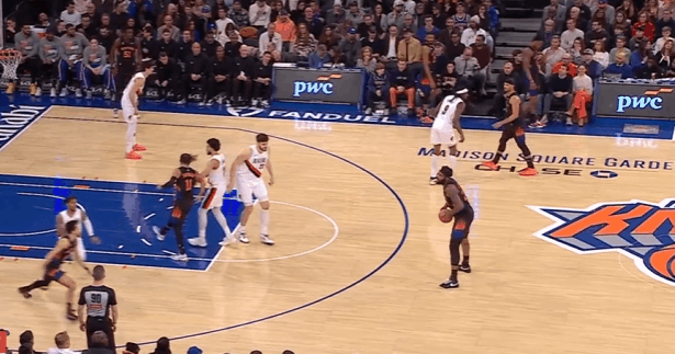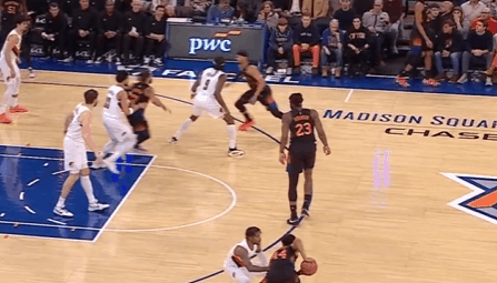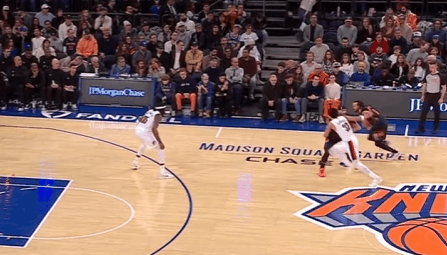P5持球推进途中,布伦森直接借助米罗在中线位置掩护持球向右翼行进。行进间小跳犹豫后立即使用内侧脚蹬地回拉至三分线外,随即衔接横撤步三分手起刀落打成2+1。慢动作细节呈现:P6