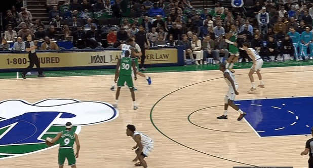 P6挡拆行进间使用“人质运球“将追防的克尼普尔卡在身后,随即上步急停起抛投终结打击沉退的迪亚巴特。