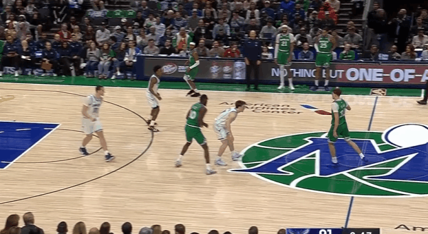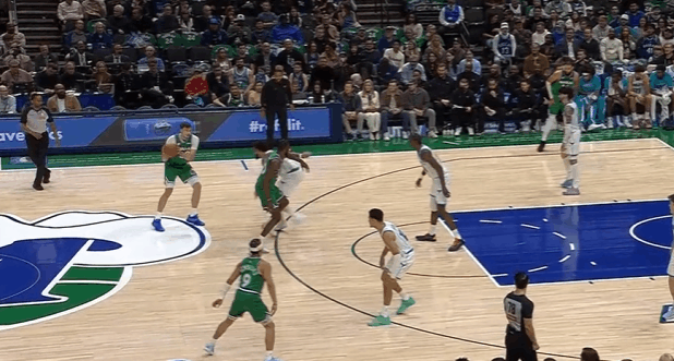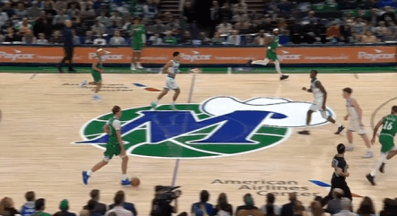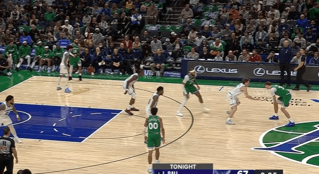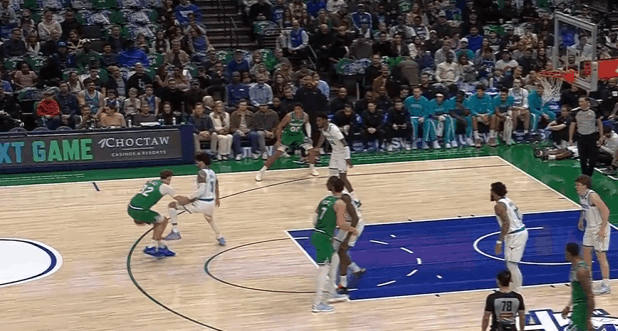 P7中圈位置和西塞的“Drag Screen”发起,同样是在挡拆行进间使用“hostage dribble”将克尼普尔卡在身后,随后在身后追防克尼普尔、面前护框瑞安、身侧协防塞克斯顿三人围剿执行,人群当中撩起手臂合球后一记抛投终结稳稳命中。