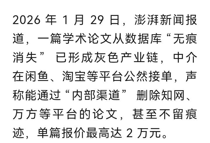是“撤稿”还是“销赃”?从前掏钱让论文“见光”,现在掏钱让论文“蒸发”?一篇两万!(详见附图) 最近冒出条黑产链,名叫“无痕撤稿”。简单说就是:有人专门帮问题论文作者悄咪咪删论文,尤其盯着知网,明码标价——一篇两万,童叟无欺。 据说生意火爆,客户大多是当年“掏钱发论文”那拨人,如今在整顿高压下急着毁灭证据,从“制造学术垃圾”快进到“销毁学术罪证” 这操作就像学术版“一条龙服务”:先帮你把废铁镀金塞进期刊,等东窗事发,再帮你把镀金层刮掉扔进熔炉。只是当年花钱买的是“马甲”,如今花钱买的是“橡皮擦”…… 背后折射的怪象更耐人寻味: 1. 某些期刊从前收钱就盖章,现在收钱就删档?合着成了“论文银行”,存取自由还带销毁服务? 2. 作者们慌的不是学术瑕疵,而是“痕迹还在网上”?整顿要治的本是根源,如今却催生出“擦屁股产业”…… 3. 知网等平台是否成了隐形帮凶?论文说撤就撤,学术记录难道能像朋友圈一样随手删除? 呵呵,早知今日,何必当初……哦不对,当初也是花钱的。 如果论文能像买菜一样“七天无理由退款”,那学术严肃性还剩多少? 整顿学术乱象,是该狠抓“发论文的胆子”,还是该堵死“撤论文的门路”? 你怎么看?欢迎评论区聊聊吧!