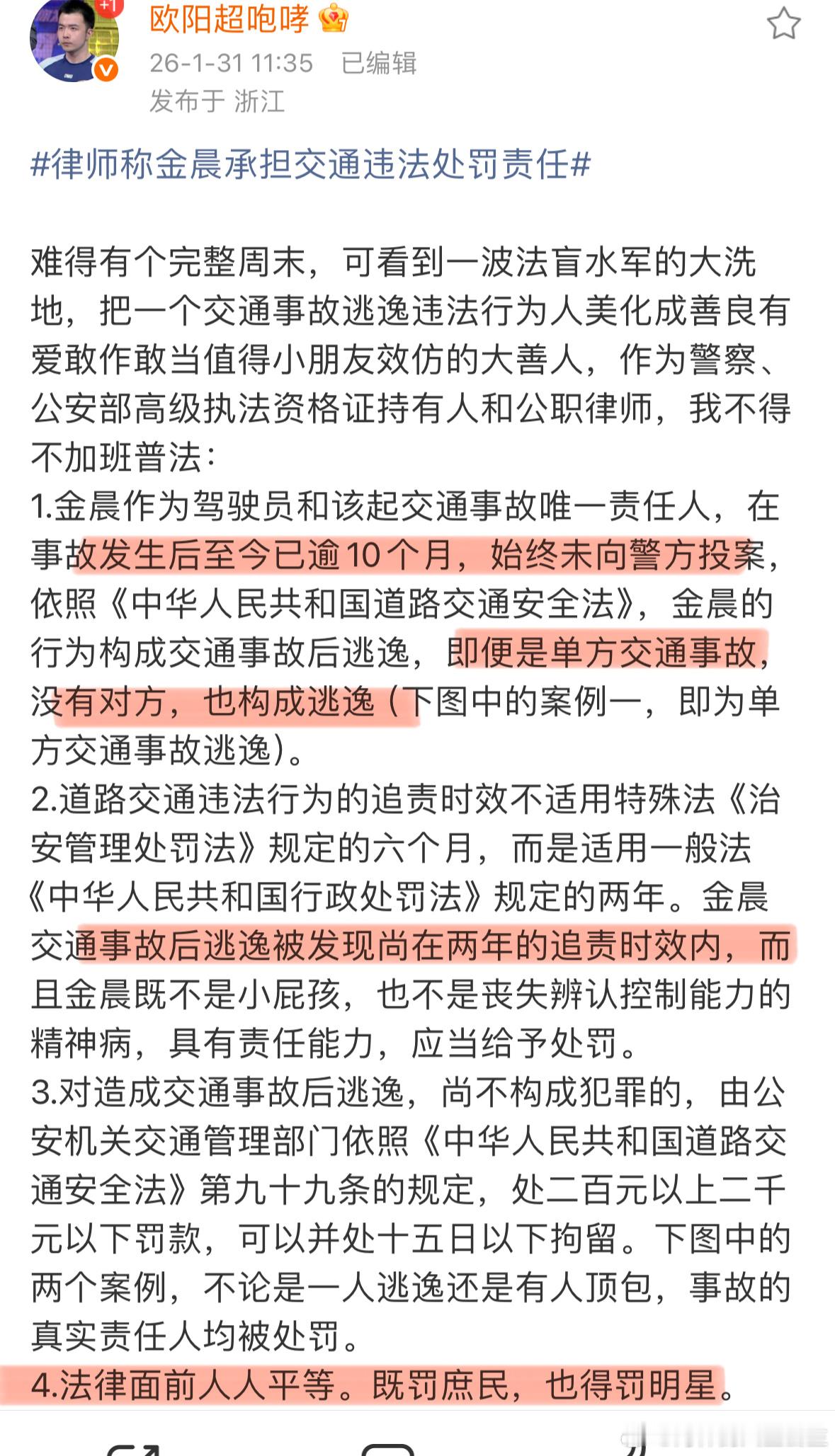 欧阳超加班科普金晨肇事逃逸事件 奇葩说辩手同样也是在职👮的欧阳超 发文抨击金晨肇事逃逸事件,指出相关知识如下1、事故发生后迄今10个月始终未向jc投案2、金晨事故还在两年追溯实效内3、事故真实责任人要得到惩罚4、总结升华