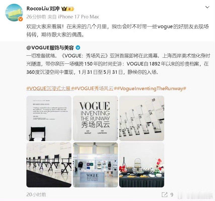 刘冲辟谣被vogue辞退31日,网传刘冲被VOGUE辞了,引发热议。转发《VOGUE》活动,并透露未来几个月也会带朋友到现场去,否认该传闻。刘冲辟谣