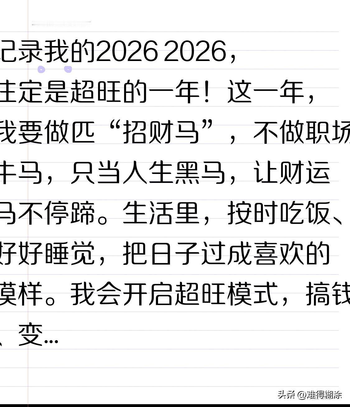 记录我的2026 2026,注定是超旺的一年!这一年,我要做匹“招财马”,不做职场牛马,只当人生黑马,让财运马不停蹄。生活里,按时吃饭、好好睡觉,把日子过成喜欢的模样。我会开启超旺模式,搞钱、变美、爱自己,让所有美好“马”上发生,旺到离谱!