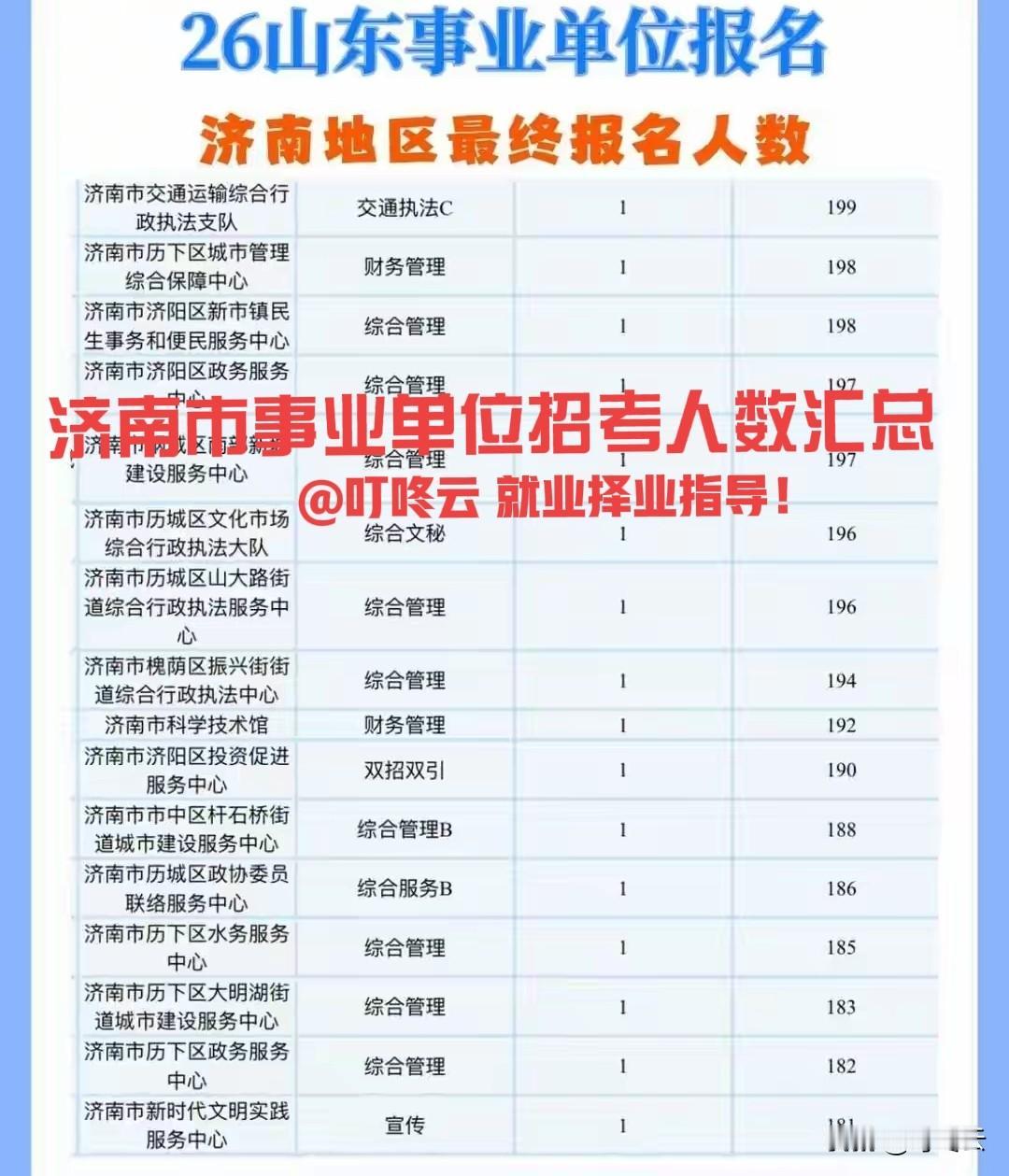 卷出天际线,636:1!山东省26年事业单位招考济南市报名人数汇总合集!济南太强势,再创新高!最热门单位,就在历城区济南东站综合服务中心,综合管理岗位,636:1!济南市市中区商务服务中心,商务管理B岗,533:1!这些岗位热度都很高,竞争比远超去年500:1!由此及彼,我们不禁想起了赫赫有名的山东英雄——秦琼秦叔宝,马踏黄河两岸,锏打三州六府!这位同学是大将收割机,实力爆棚!记得这位同学的祖籍是济南府历城县!山东老师儿,学学这位同学的奋斗精神!速速围观揭秘详细内容![点亮平安灯][点亮平安灯][捂脸][捂脸] 欢迎关注@叮咚云 将优先为粉丝职业规划指导,1对1咨询是付费服务,为你定制最适合的就业择业方案!欢迎留言交流讨论。[来看我][来看我] 免责声明:图片来自网络,仅供参考! 央国企招聘 山东企业 济南企业排行 济南企业