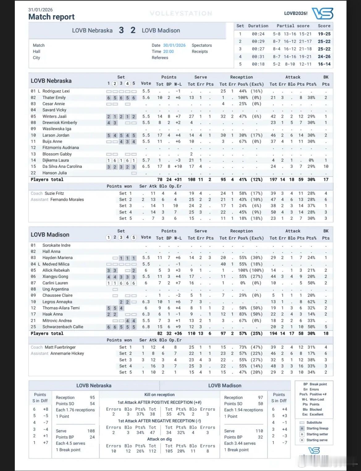 【LOVB第五轮麦迪逊2-3内布拉斯加,小宇11分】世界女排新闻龚翔宇 美国LOVB女排联赛第五周赛事,中国球员龚翔宇效力的麦迪逊2-3不敌内布拉斯加,25-19/22-25/22-25/26-24/14-16龚翔宇拿到11分(44扣9中3失误4被拦2拦,11个一传0失误,到位55%完美率27%)净得分4分此前四场比赛2胜2负)第一轮3-0盐湖城第二轮3-1内布拉斯加第三轮2-3奥斯汀第四轮2-3盐湖城