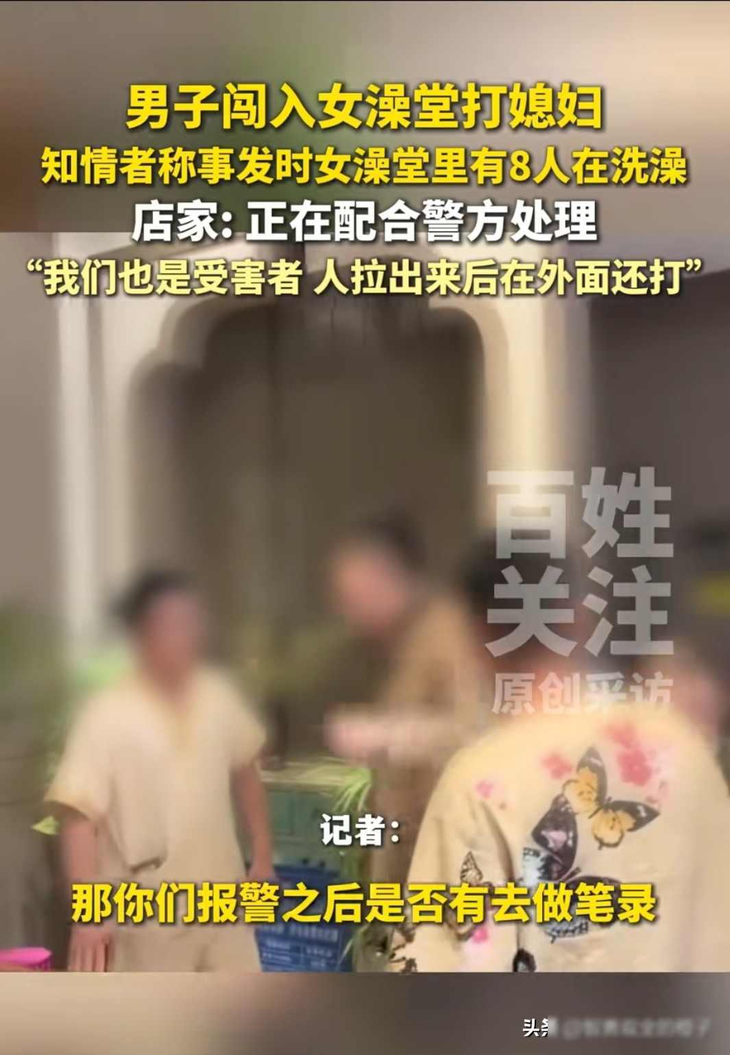 明目张胆的耍流氓!河南,夫妻二人去澡堂洗澡,不知为何,丈夫突然冲进女澡堂内打妻子,当时里面还有7、8位女士在洗澡,后来男子被拉出澡堂,却依然不停的打骂妻子。 河南某天傍晚,一家普通澡堂里突然有人喊叫,一个男人冲破更衣区的隔板,直往女宾那边跑,当时好几个女人正泡在池子里,场面一下子乱了。 等大家看清楚闯进来的是之前和他老婆一块儿进来的中年男人,更衣室外面已经吵开了。 他正对着浑身湿透的老婆又打又踢,有人上去拉他,他还是骂个不停,直到被人拖出去,嘴里还不停地骂。 警察来了把闹事的人带走了,可事情没完,几个女的站出来嚷嚷。 他说能办男宾卡直接冲进女浴区,那登记不就是摆设吗。 她们要澡堂赔精神损失,还说要把这事捅出去,老板瘫在收银台那儿,手机一个劲儿响,都是人打电话要退会员卡。 有网友翻出监控细节,你们看这个刷卡机,他妻子明明拿着女宾的钥匙扣,这男人怎么进得来。 更多人转头骂施暴者,除非他能说清楚自己是盲人,不然这种当众动手的事,必须严惩,现在当地派出所已经插手查这对夫妻的家事,澡堂有没有违规,结果还没出来。