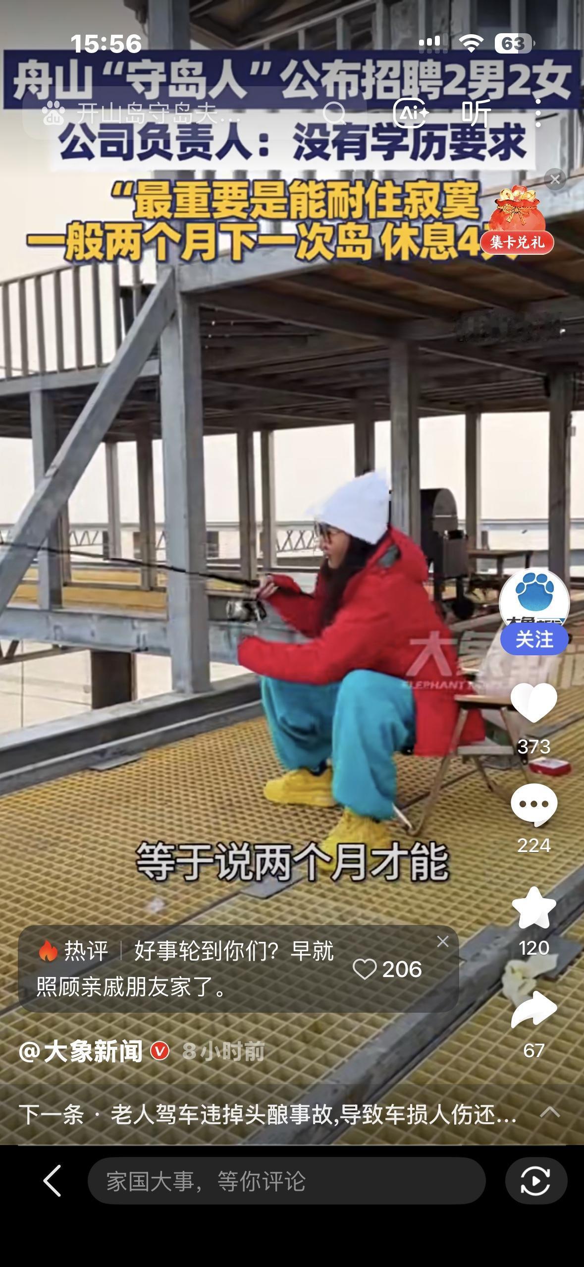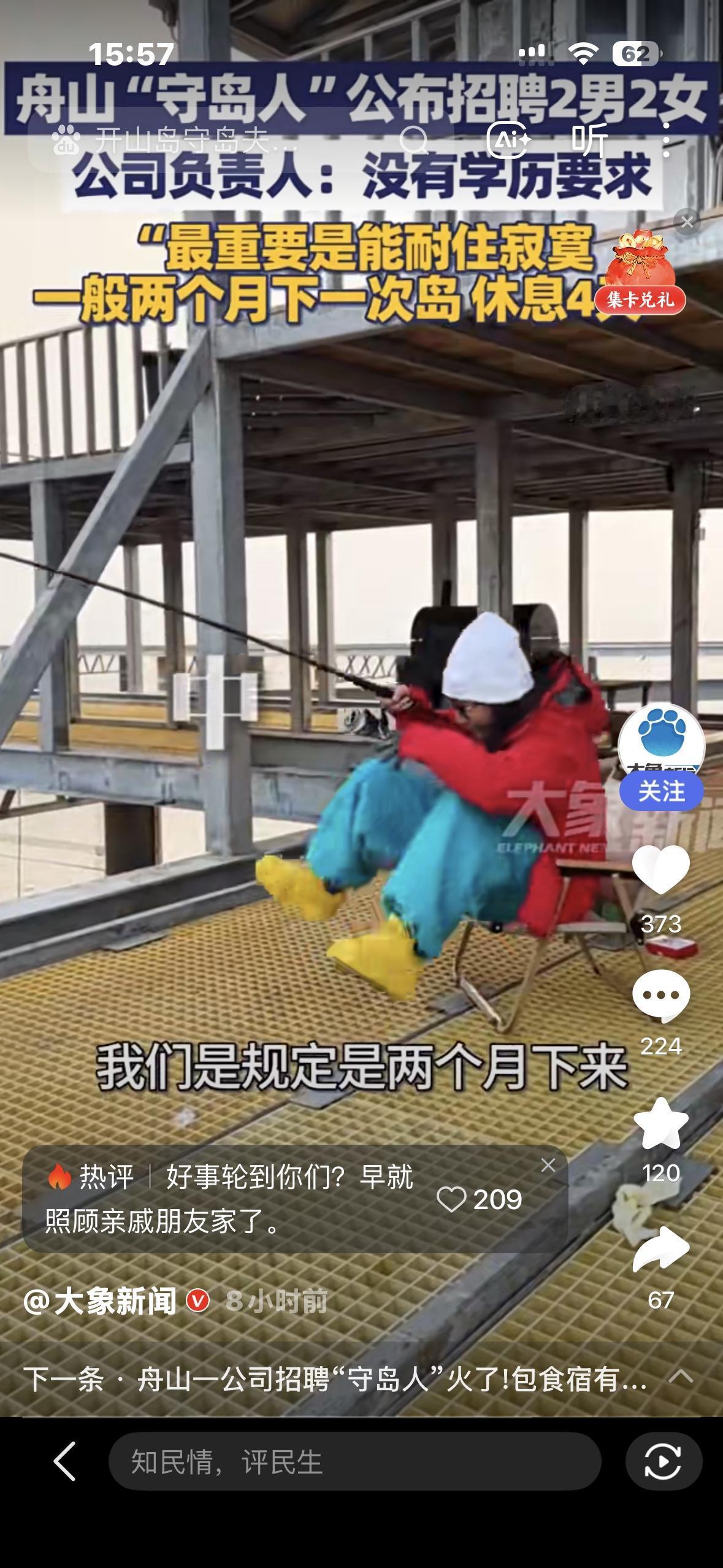 1月29日,浙江舟山一家养殖企业发布特殊招聘启事,面向社会招募2男2女共四名“守岛人”,需驻守远离大陆的荒岛,期间无法随意离岛,物资每周由船只补给,每两个月可下岛休整一次,可以休息4天。
