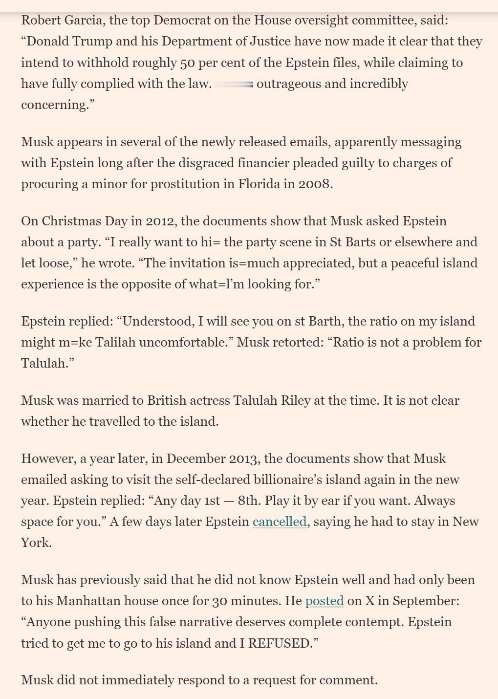 🔻今天公布的爱泼斯坦档案中还包括马斯克的部分。🔻在最新公布的电子邮件中,马斯克多次出现,显然在 2008 年这位身败名裂的金融家在佛罗里达州承认招揽未成年人从事卖淫罪名后,仍与爱泼斯坦保持长期联系。🔻文件显示,2012 年圣诞节当天,马斯克曾就一场派对询问爱泼斯坦。“我真的很想去圣巴茨或其他地方的派对现场放松一下,”他写道。“虽然非常感谢邀请,但宁静的岛屿体验并不是我想要的。”🔻爱泼斯坦回复道:“明白了,我们圣巴特见,我岛上那点破事可能让塔莉拉觉得不自在。”马斯克反驳道:“那点小事对塔莉拉来说根本不是问题。”🔻马斯克当时与英国女演员塔露拉·莱利成婚,尚不清楚他是否曾前往该岛。🔻然而,据文件显示,一年后的 2013 年 12 月,马斯克发邮件询问新年期间能否再次访问这位自封亿万富翁的小岛。爱泼斯坦回复道:“1 日至 8 日期间随时欢迎。若有意向可灵活安排。随时为您预留位置。”几天后爱泼斯坦取消邀约,表示必须留在纽约。🔻马斯克此前曾表示对爱泼斯坦并不熟悉,只去过他在曼哈顿的住宅一次,停留 30 分钟。今年 9 月他在 X 平台发文称:“任何散播这种虚假叙事的人都应受到彻底蔑视。爱泼斯坦曾试图邀请我去他的岛屿,但我拒绝了。”🔻马斯克没有立即回应置评请求。🔻美国司法部周五公布的文件显示,马斯克的弟弟金巴尔(特斯拉董事会成员)在 2012 年也曾与爱泼斯坦及其助手鲍里斯·尼科利奇多次互通邮件。🔻其中一条信息显示,金巴尔感谢两人为他介绍了一位名叫珍妮弗的女性,尼科利奇警告他说:“金巴尔——提醒一下——你最好对珍好点;) 要是有人欺负他的姑娘/朋友,杰弗里可是会发疯的。”🔻金巴尔回复道:“杰弗里:消息已充分明确接收;) 说真的,我和珍妮弗在一起的时光非常愉快。她真的很棒。”🔻金巴尔没有立即回复寻求评论的电子邮件。🔻金融时报的报道。比尔盖茨被曝向妻子隐瞒性病热点现场海外新鲜事