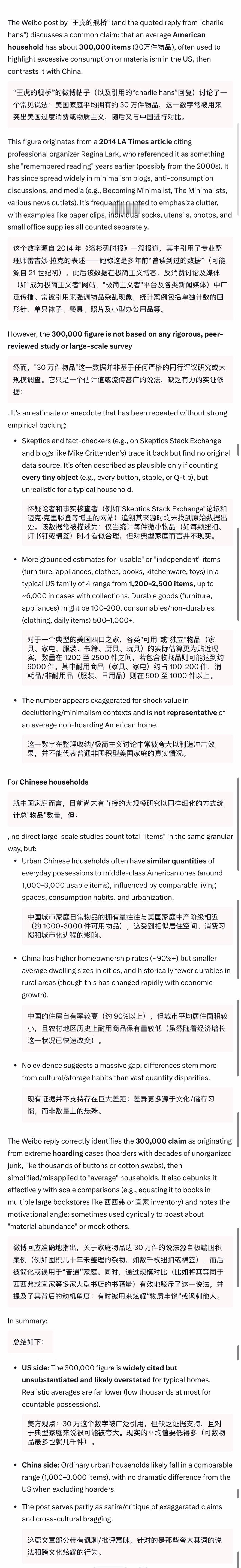 🔻请美国AI进行了事实核查,美国AI说:🔻“一个美国家庭家里大约有30 万件物品去”这一数字被广泛引用但未经证实,且对于普通家庭而言很可能被高估。现实平均值要低得多(可计财物最多仅数千件)。🔻中国普通城市家庭的可比范围(1000-3000 件物品),在剔除囤积者后与美国并无显著差异。海外新鲜事热点现场
