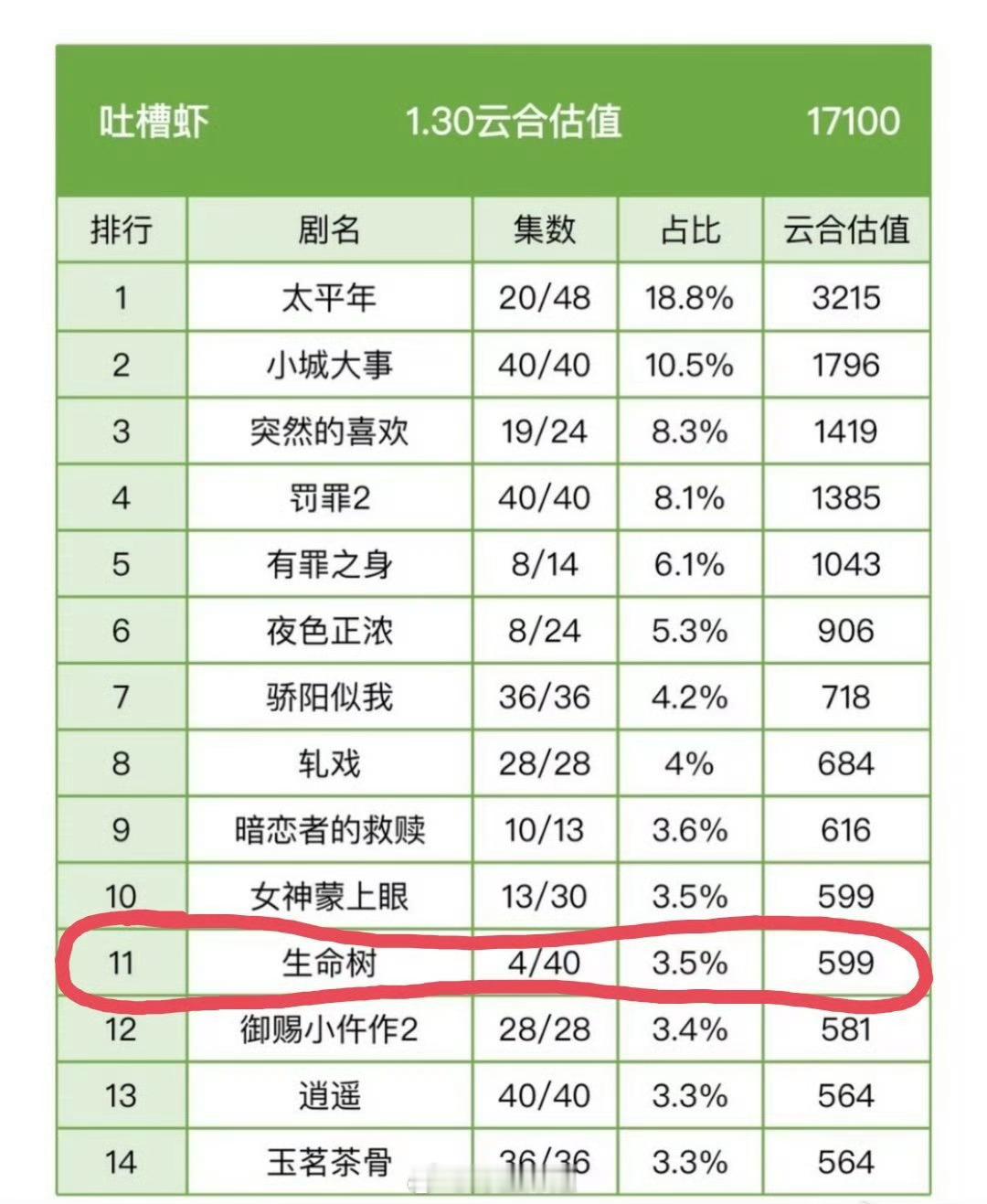 杨紫 胡歌《生命树》首日云合出来了,占比3.5%,预估播放量580w左右