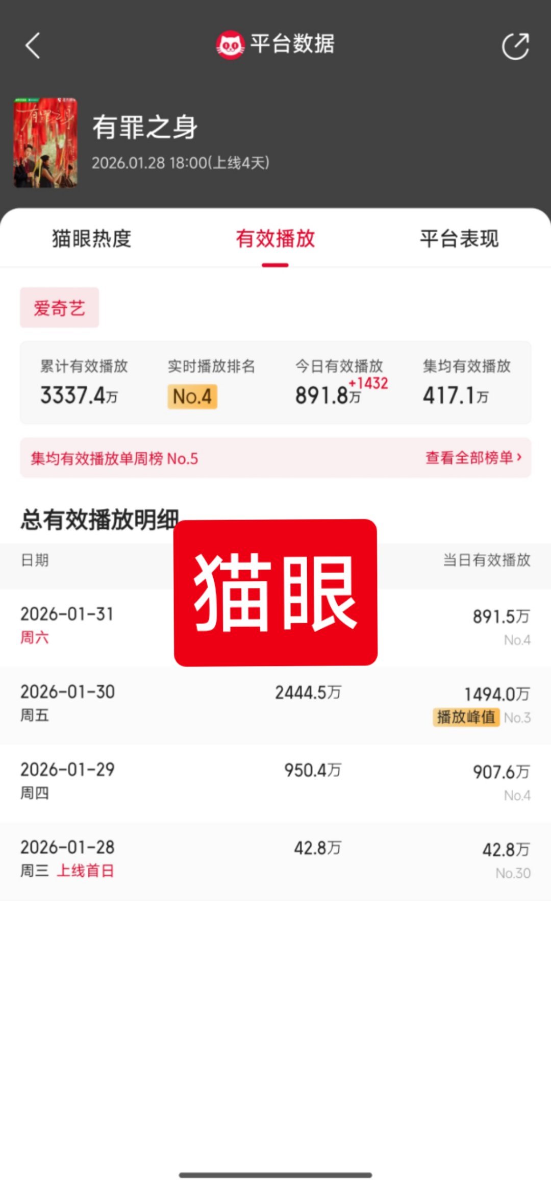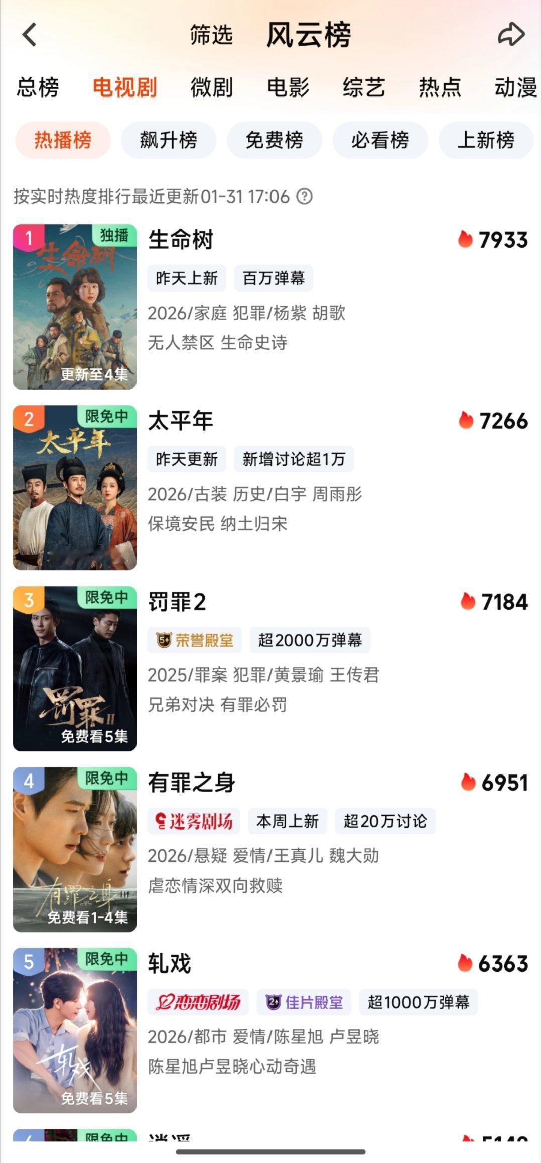 先不管杨紫的《生命树》,魏大勋一番的《有罪之身》才是扑的很瓷实!爱奇艺站内排第四,热度最高7071,集均417。