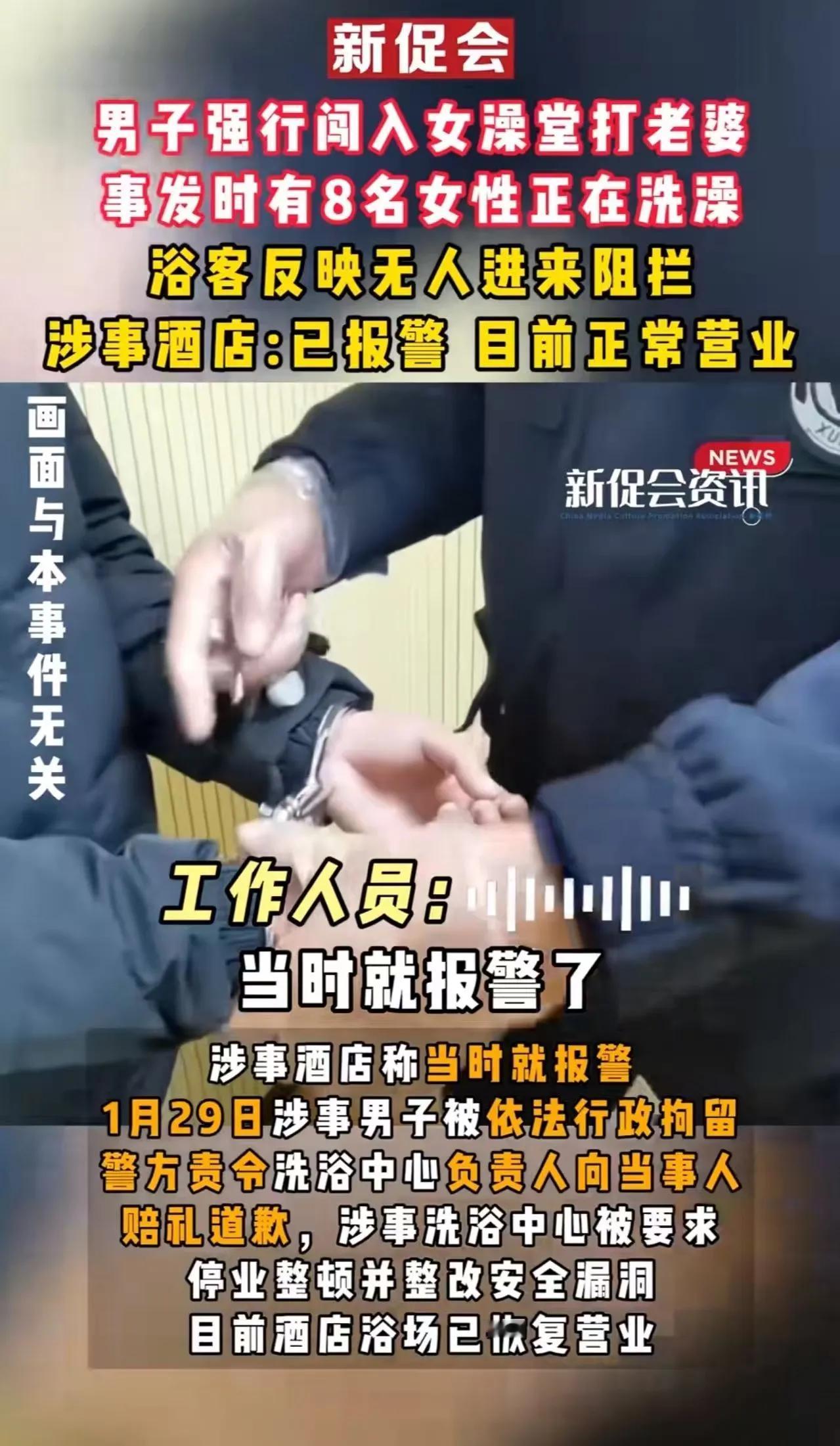 男子闯女澡堂打老婆,8人受惊滞留6分钟,20张澡票想息事宁人?警方已控制 1月28日晚近午夜,河南鹿邑县某酒店公共浴池,一名男子强行闯入女澡堂殴打女子。 当时8名女性正在洗澡,见状纷纷惊叫躲闪,有人滑倒在地,男子滞留六七分钟才被拉出。 争议焦点集中在男子侵犯隐私、浴池应急滞后,而20张澡票的补偿方案遭受害者集体拒绝。 当晚近午夜,该酒店女澡堂内,8名女性正泡在氤氲热气中洗去一天疲惫。 浴室门突然被“砰”地撞开,一名男子怒气冲冲闯了进来,径直扑向一名正在冲洗的女子。 他抬手就扇了该女子一巴掌,嘴里还不停骂骂咧咧,动作又快又狠。 现场瞬间乱作一团,尖叫声、哭喊声此起彼伏。 有女性慌忙抓过身边的毛巾遮挡身体,有人吓得缩到浴池角落浑身发抖,还有人因为地砖湿滑,脚下一滑摔倒在地,身上沾满水渍和泡沫。 大家都没料到,本该私密安全的女澡堂,会突然闯进陌生男子,还发生暴力行为。 浴池工作人员当时正在附近值守,听到动静后立刻赶过来阻拦。 可男子冲得太急,工作人员刚靠近就被他推倒在地,没能第一时间把人拉出去。 从男子闯入澡堂,到最终被众人合力拉出,前后一共持续了六七分钟。 被拉出女澡堂后,男子的情绪依然激动,还在澡堂门外继续殴打那名女子。 在场有顾客实在看不下去,又担心出现更严重的后果,当即拿出手机报警。 民警接到报警后迅速赶到现场,将还在争执的男子强行带离,随后展开调查。 目前,涉事男子已经被警方依法控制,案件还在进一步侦办当中。 警方表示,会依法依规处理此事,相关调查结果后续会根据情况公布。 事件发生后,浴池方面给出了补偿方案:给当时在场的每位女性赠送20张澡票。 可这个方案遭到了所有受害者的拒绝。 她们说,当时被男子看光了身体,个人尊严碎了一地,这种伤害不是澡票能弥补的。 以后再也不敢去这家浴池洗澡了,觉得这里连最基本的隐私和安全都保障不了。 有网友曝光了现场相关监控画面,画面显示,从男子破门闯入,到工作人员出现阻拦,中间有明显的时间空档。 这也让大家质疑,浴池的安全管理和应急机制存在漏洞。 浴池方面回应称,自己也是这次事件的受害者,已经全力配合警方的调查工作。 同时坚称,工作人员当时第一时间就进行了阻拦,只是没能成功拦住男子。 从法律角度来看,男子强行闯入女澡堂的行为,涉嫌非法侵入他人隐私场所。 他在公共场合殴打女子,属于家庭暴力,同时还扰乱了公共场所的正常秩序,另外还构成了对在场其他女性的公然侮辱。 这些行为叠加,已经不是简单的“夫妻吵架”,而是涉及多项违法的行为。 对于普通人来说,遇到类似的突发情况,首先要保证自身安全,尽量远离冲突现场,避免被误伤。 然后第一时间报警求助,保留好相关的证据,比如现场照片、监控录像、证人联系方式等。 如果自身权益受到侵害,比如隐私被侵犯、身体受伤,可依法向相关责任人追究民事赔偿责任,维护自己的合法权益。