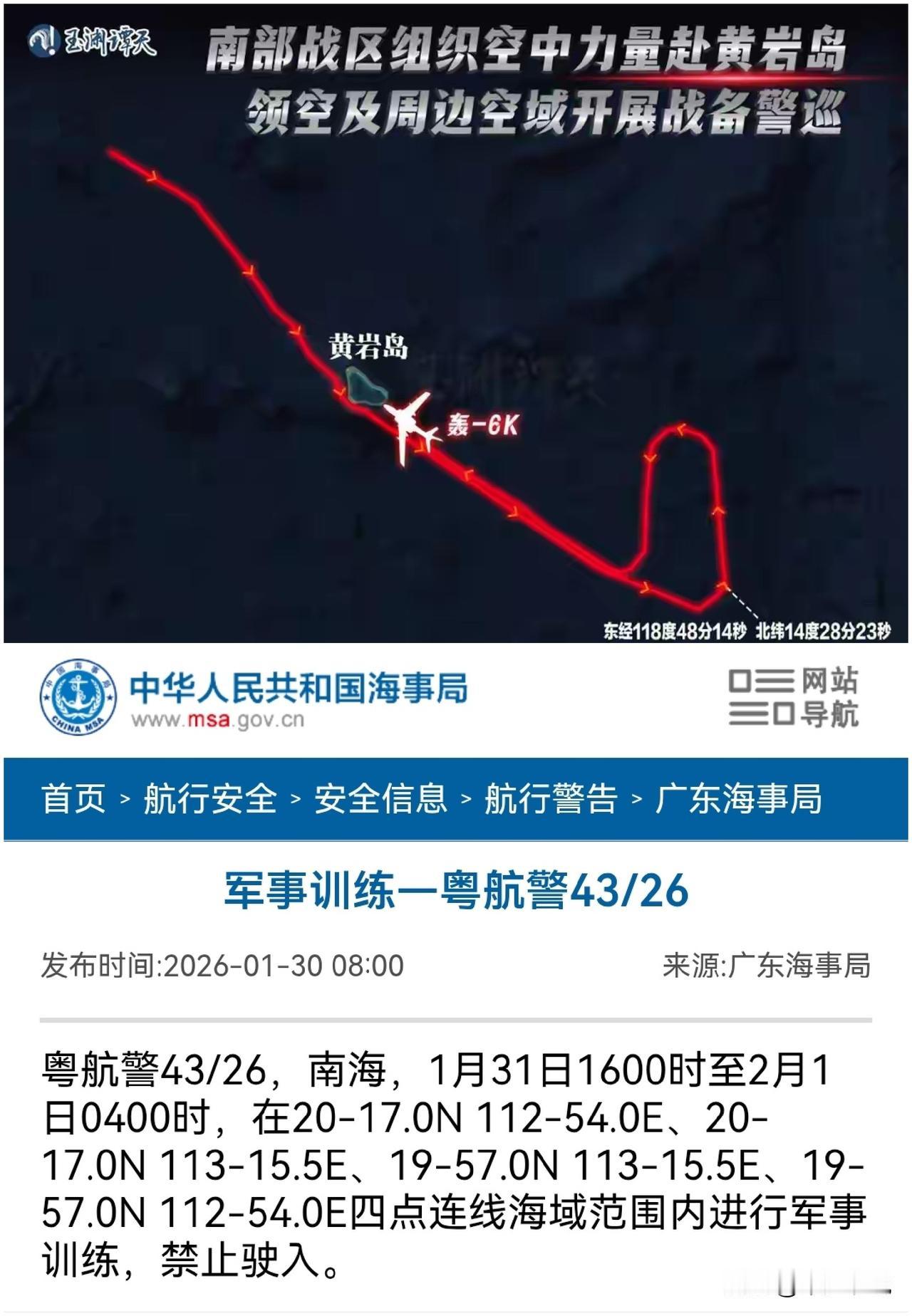 轰六飞越菲律宾演习区域之后军事演练来了 今天国家海事局公布自1月31日16时至2月1其4时在南海海域进行军事训练,而在此之前轰六轰炸机直接飞越菲律宾划定的演习区域,现在还不知此次军事训练是否是针对菲律宾演习,但是同处南海,针对意味十足。