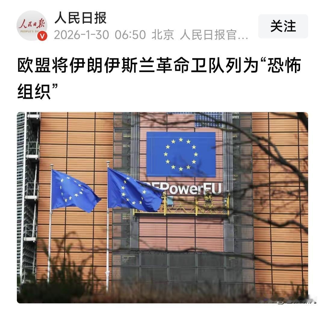 欧盟将伊革命卫队,列为“恐怖组织”!伊朗发表声明,强烈谴责欧盟违反联合国宪章与国际法,干涉伊朗内政! 欧盟为何把伊朗革命卫队,列为“恐怖组织”?是否因为不久前,在平息伊朗骚乱中,革命卫队起到关键作用? 伊朗为何谴责欧盟,违反联合国宪章与国际法,干涉伊朗内政?只因伊平息内乱是自己的事,欧盟凭什么干预? 对于谁对谁错?苍狼不做评判。但感觉这件事情不简单:虽在经贸与挺乌,格陵兰态度上,美欧有重大分歧!但其他重大问题,他们还是步调一致的。 比如:北约离不开老美,欧盟需要老美当后台,尤其对于中东格局,美欧以价值去取向是一致的!伊朗扶持“哈真胡叙”,制造中东动荡,确实不光彩。 这次伊朗平息国内骚乱,让美以找到了借口,想彻底解决伊朗问题。美军已部署到位,以色列也已做好准备,欧盟表态是对美以最大支持。只待时机! 美以公开态度,是伊朗销毁核设施!无论民用军用,都事关国家主权,伊朗岂能答应?也许美以料定伊不答应,才如此要挟?其根本目的是换掉神权! 美以欧可能认为,现在是最好时机!因哈伊“大哥”,深陷泥潭无暇他顾,等乌战结束就难办了!目前美以箭在弦上,伊朗枕戈待旦,谁能笑到最后呢? …………