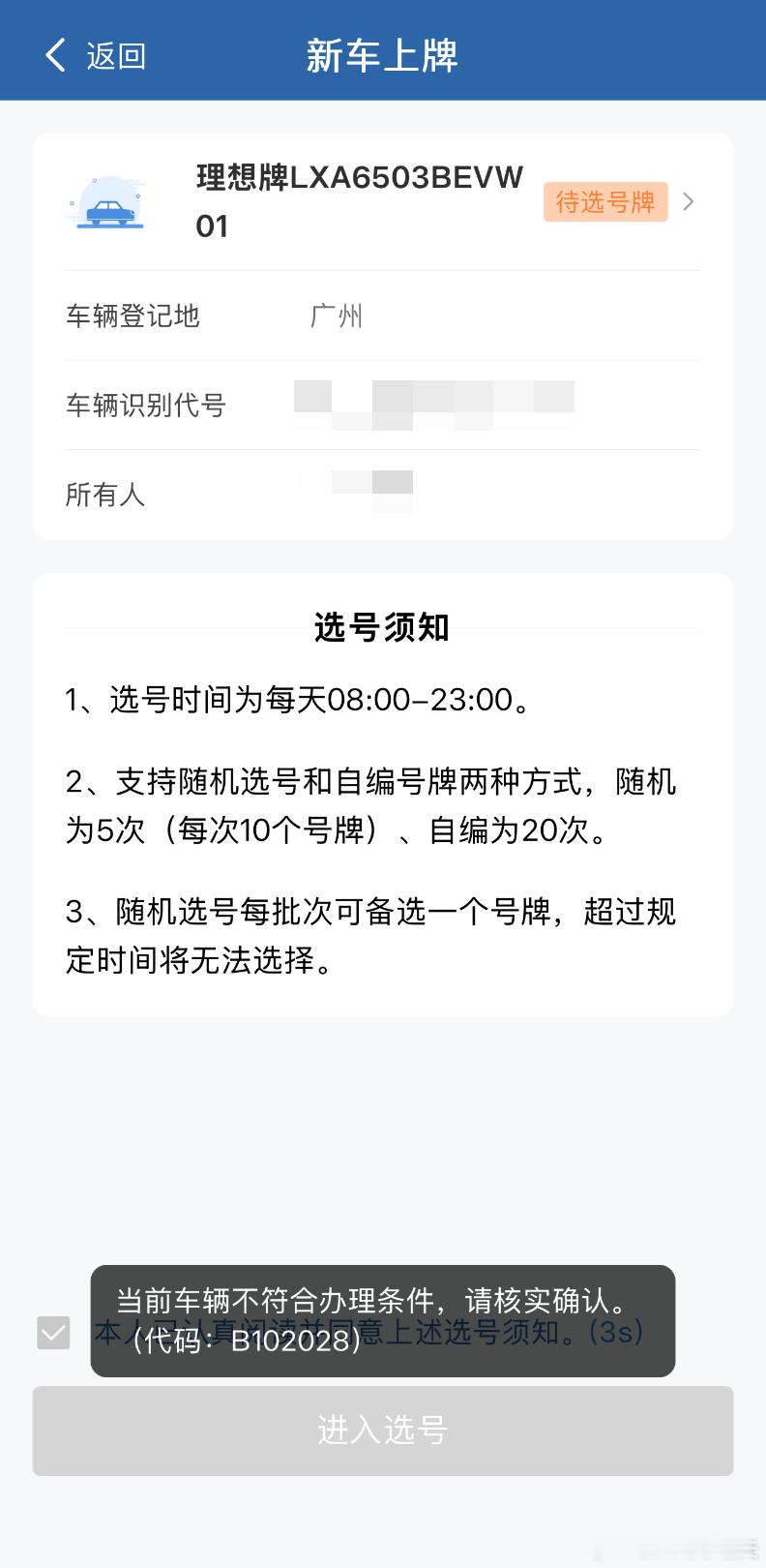今天跑车管所是因为选号的时候出bug了(图2),我上次线上选号弃选没给我拉出小黑屋。