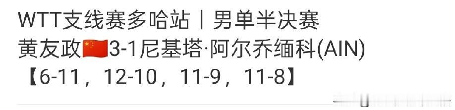 黄友政赢了,男单独苗进决赛。 黄友政半决赛让一追三,逆风翻盘进决赛。 感觉黄友政距冠军越来越近,说不定还真能二冠王,现在看最差也是双亚。 多哈站黄友政支棱起来了,在温瑞博一轮游后,黄友政扛下了所有,四强只有他一个独苗,又足够坚定挺进决赛。 如此看来小女友韩菲儿就没那么幸运,2-3输队友止步四强,顶峰相见没能实现。 接下来黄友政还有男双决赛,一天三赛对他来说消耗很大,但愿都能扛下来,实现双喜临门。 加油黄友政,一定要珍惜这个机会,也该你拿冠军了。 图片来自网络侵权可删。