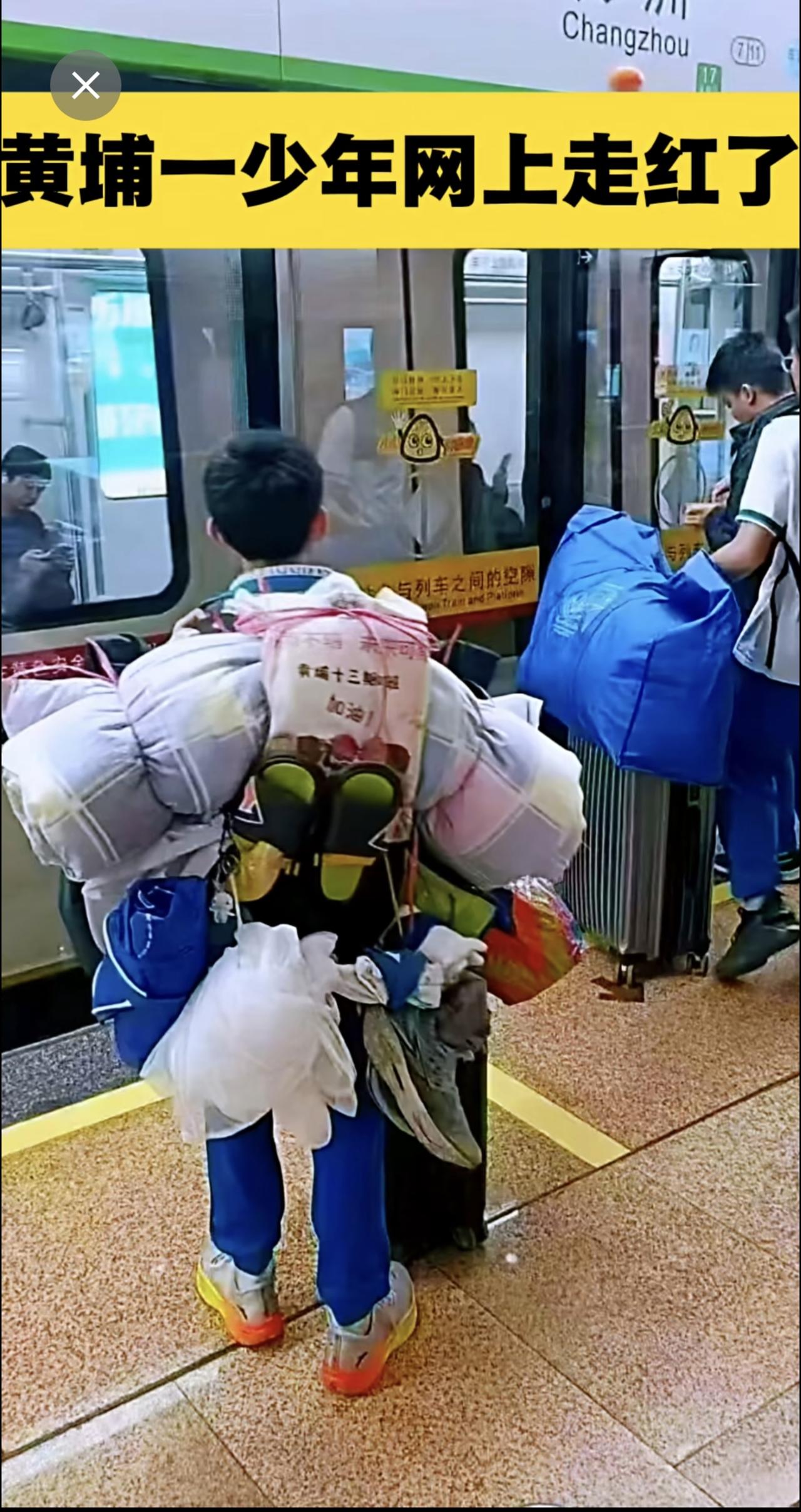 黄埔一少年放假回家坐地铁,独自打包背起全部家当,宛如一座行走的小山,背影令人动容!