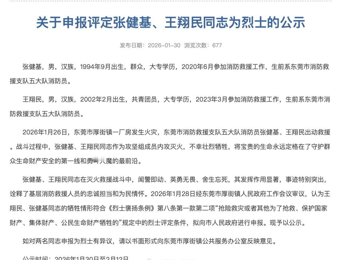 【东莞两名消防员灭火牺牲当地拟申报烈士,东莞牺牲消防员家中还有两名孩子,家属发声】1月30日,广东省东莞市厚街镇人民政府官网发布关于申报评定张健基、王翔民同志为烈士的公示: 张健基,男,汉族,1994年9月出生,群众,大专学历,2020年6月参加消防救援工作,生前系东莞市消防救援支队五大队消防员。 王翔民,男,汉族,2002年2月出生,共青团员,大专学历,2023年3月参加消防救援工作,生前系东莞市消防救援支队五大队消防员。 2026年1月26日,东莞市厚街镇一厂房发生火灾,东莞市消防救援支队五大队消防员张健基、王翔民出动救援。战斗过程中,张健基、王翔民同志作为攻坚组成员内攻灭火,不幸壮烈牺牲,将宝贵的生命永远定格在了守护群众生命财产安全的第一线和勇斗火魔的最前沿。 张健基、王翔民同志在灭火救援战斗中,闻警即动、英勇无畏、舍生忘死,其发挥作用显著,事迹特别突出,诠释了基层消防救援人员的忠诚担当和为民情怀。2026年1月28日经东莞市厚街镇人民政府工作会议审议,认为王翔民、张健基同志的牺牲情形符合《烈士褒扬条例》第八条第一款第二项“抢险救灾或者其他为了抢救、保护国家财产、集体财产、公民生命财产牺牲的”规定中的烈士评定条件,拟向市人民政府进行申报。现予以公示。 1月28日,@潇湘晨报 记者曾联系上了牺牲消防员王翔民的一位亲属,他说王翔民今年未满24岁,做了三年消防员,在这次救火中不幸去世。家人已经从老家广东阳春赶到东莞,住在政府安置的酒店,28日上午把王翔民从医院送去殡仪馆,“政府工作人员说当时送去医院抢救,几个小时后抢救无效死亡。” 此外,这名家属还告诉记者,另外一名去世的消防员张健基今年31岁,家里还有两个孩子,分别是6岁和3岁。 王翔民家属告诉潇湘晨报记者,他们获得的消息是,火灾现场发生了坍塌,两人无法及时撤离,不幸壮烈牺牲。此外有知情人士向记者确认了家属的说法,称火灾现场发生了坍塌。 1月28日,记者曾联系东莞市消防救援支队,一名工作人员称,两方家属已经来到东莞,正在积极对接善后事宜,同时按照正规程序处理此事,“等最后官方通知吧,我们现在的大部分精力都在家属身上。” 潇湘晨报·晨视频记者 钱嘉鑫