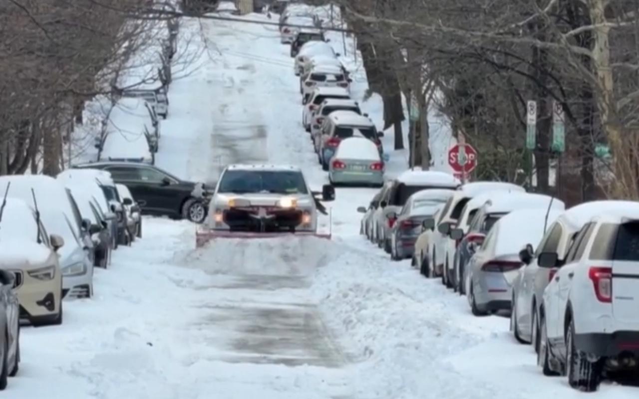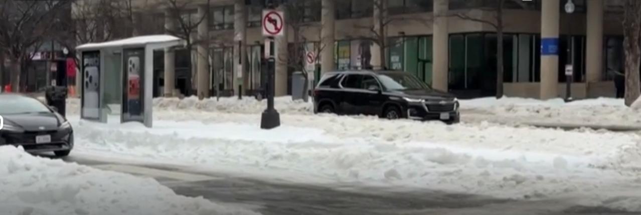 暴雪过后的北美城市街头,积雪厚积在道路与车身上,车辆在湿滑路面缓慢行驶,行人裹紧衣物艰难穿行。路边的汽车被白雪覆盖,公交站台也积起厚厚的雪堆,整座城市在严寒中放慢了运转的节奏,处处透着极端天气带来的生活困境。