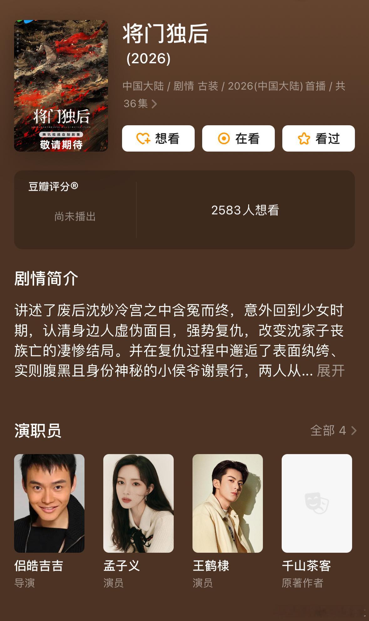 将门毒后 孟子义无缝进组新剧 将门毒后定准了 王鹤棣+孟子义 王鹤棣孟子义工作室均已公开2月行程图两人都是新剧开机,豆瓣也已出班底,导演侣皓吉吉