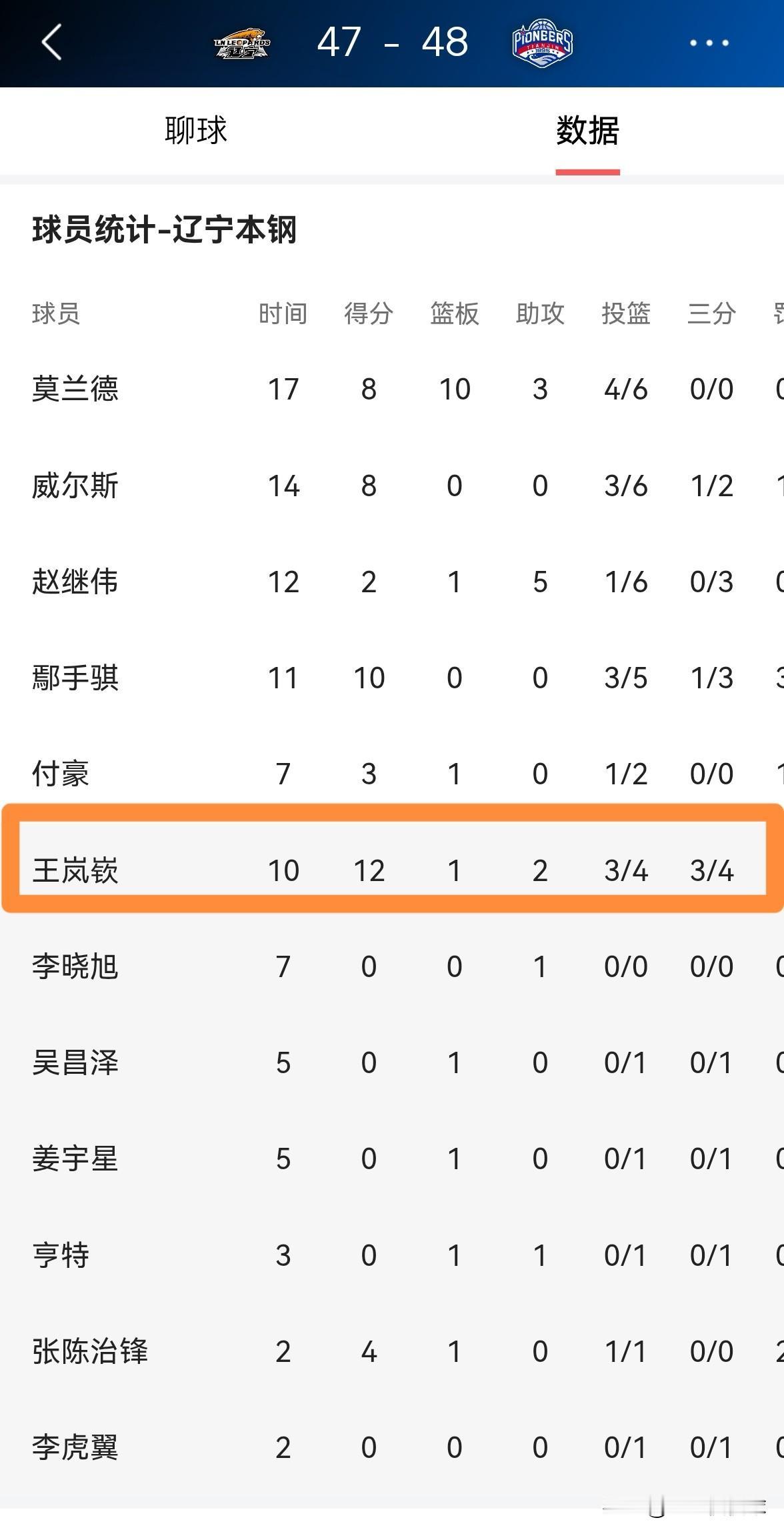 辽宁本钢大将王岚嵚的三分手感真是异常火热!在今天辽宁本钢主场迎战天津先行者的比赛中,目前双方的上半场比赛已经结束,辽宁本钢以47:48落后于对手。在前两节比赛中,王岚嵚在三分线外如有神助,他在替补出战的10分钟里,三分球4中3,其中罚球4中3非常高效的砍下12分,还有1篮板2助攻,他的场上正负值为+3。 坦白说,如果不是因为王岚嵚在上半场比赛中表现出色,辽宁本钢恐怕早已经落后天津先行者两位数了。