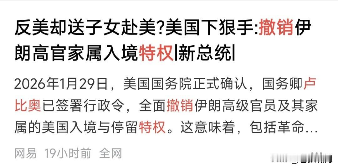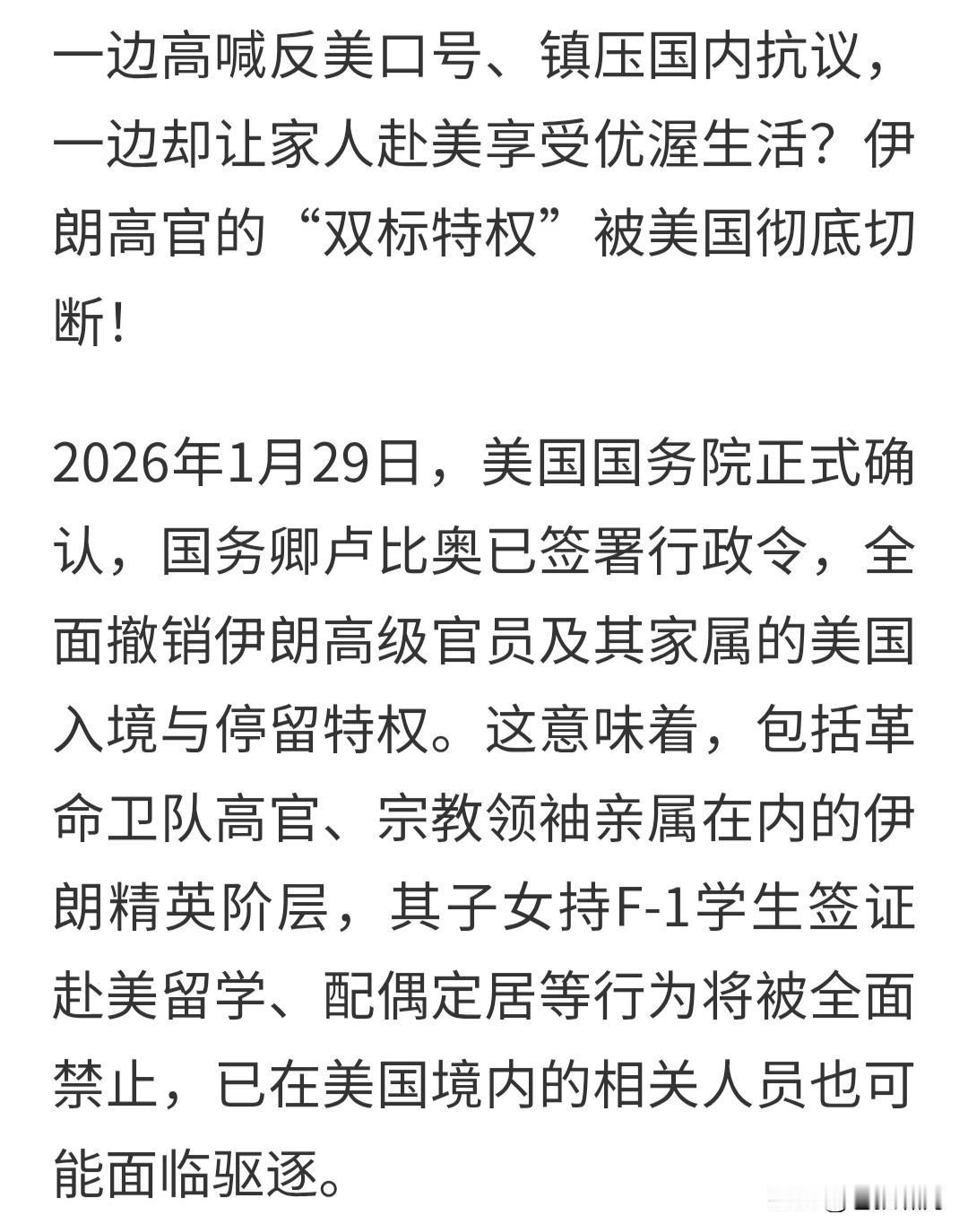 老美对伊朗“釜底抽薪”,全面取消其高官及家属的入美过境与居留权! 包括革命卫队高官,宗教领袖在内精英阶层,其子女持学生签证赴美留学,配偶定居等,将被全面禁止。已在美国境内的相关人员,将被驱逐出境。 为什么会这样呢?只因伊朗平息国内骚乱,美西方认为是“镇压民众请愿,表达正当诉求”!此举违背“国际法”与西方价值观,他们必须出手干预! 本人有点不解:伊朗既然与美就“伊核问题”僵持不下,导致双方关系紧张,为何高层家属还要去美定居,子女还要去美留学呢?实在让人想不明白。 由此联想到我们国内,那些“网红反美斗士”,也和他们如出一辙!一边反美斗西,一边把子女送美欧留学,甚至在美买房移民,在欧办好居留证? 苍狼实在看不懂,这里面的逻辑是什么呢?谁能解释清楚?不多说了!懂的人自然会懂,不懂的永远不会懂! 最后回到伊朗话题:美国跃跃欲试,以色列做好准备,欧盟在一旁拱火,其他国家干吵吵,谁愿意下场救火? 美以欧对伊朗冲突,似乎在所难免!川普软硬兼施,欲逼伊朗就范。伊朗宁折不弯!双方会发生什么?全世界都在观望。还是别打仗,谈判解决吧! …………