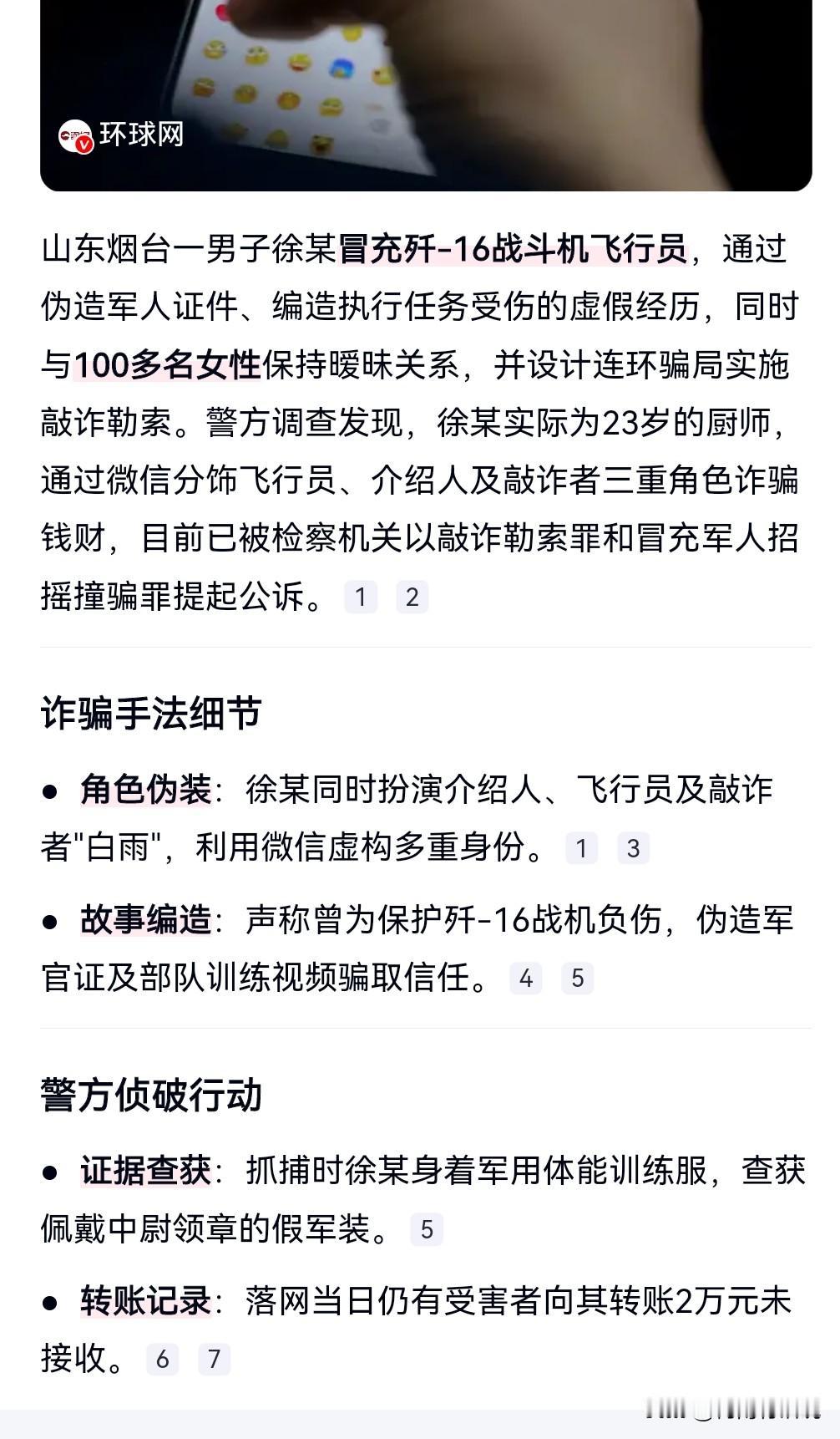 刚开始骗人钱财的那一刻,其实一只脚已经进了监狱了,被抓是早晚的事。 1月31日热搜,假“歼-16飞行员”同时与百余人暧昧。 这真是骗子中的海王啊。 冒充飞行员吸引那些女人,骗了不少女人的钱。 再狡猾的狐狸也会露出尾巴。 目前他因招摇撞骗和敲诈勒索罪被起诉。 等待他的必将是法律的严惩。 不要当骗子,当骗子这是非常愚蠢的,骗人早晚是要被别人发现的。