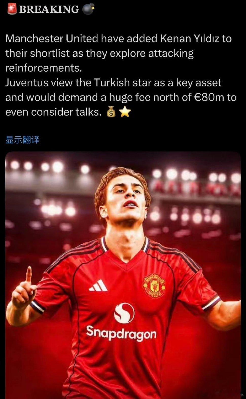 曼联这是给意甲身价挤掉水分?[捂脸]曼联要是花8000万从意甲买个前锋,真的也是吃意甲的翔上瘾了。准备再过2年,4000万卖回给意甲?曼联你干脆直接给意甲球队发钱就是了[发怒]………………………………………………………………曼联已将凯南·耶尔德兹列入引援名单,他们正在寻找进攻端的补强人选。尤文图斯将这位土耳其球星视为的关键资产,并要求超过8000万欧元的巨额转会费才会考虑进行谈判。