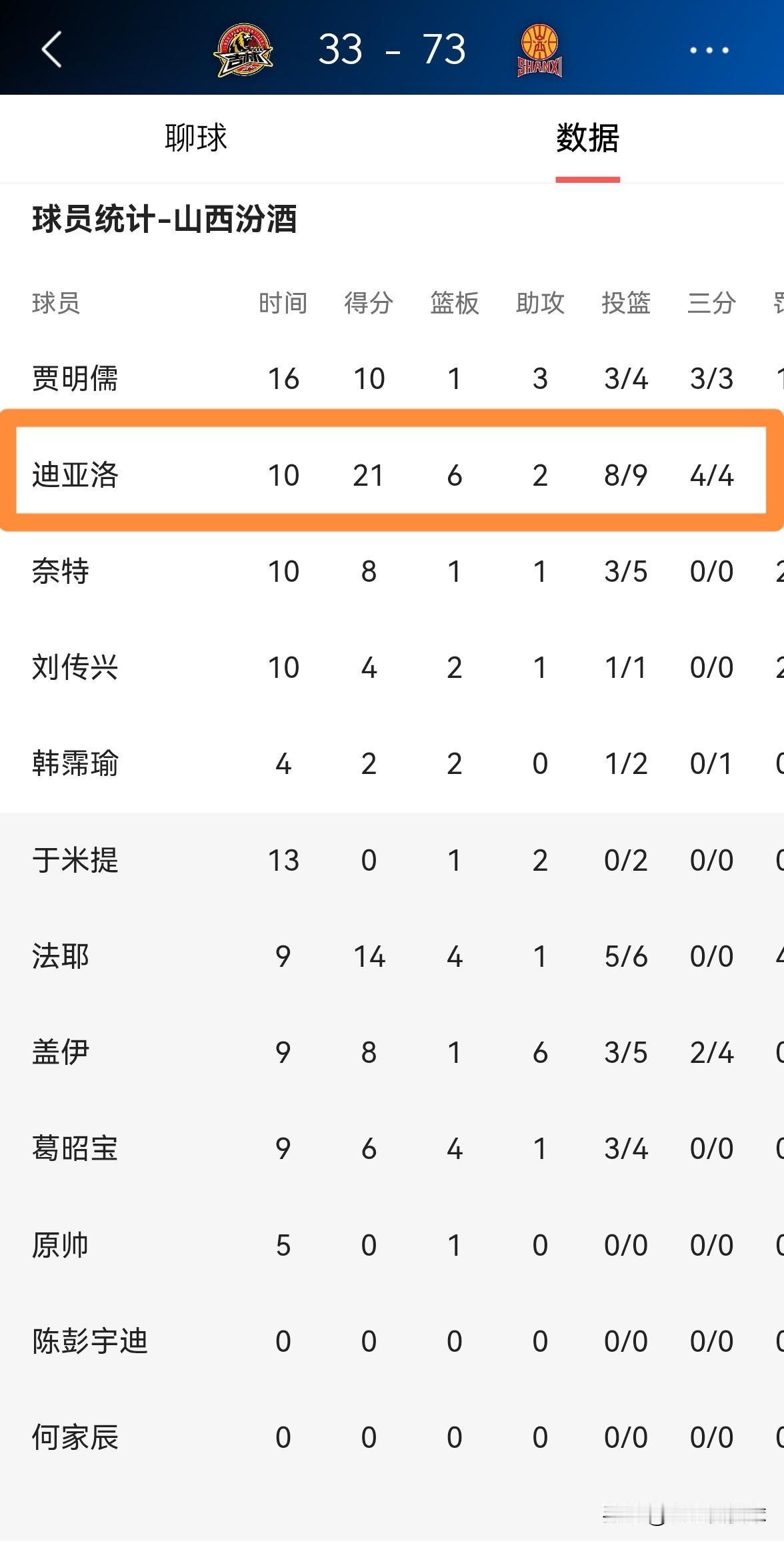 山西汾酒大外援迪亚洛真是太让人惊叹了!在今天山西汾酒客场挑战长白山恩都里的比赛中,目前双方半场战罢,山西汾酒以73:33领先对手多达40分,基本上胜局已定了。让人感到非常惊叹的是,在前两节比赛中,迪亚洛仅仅首发出战10分钟,投篮9中8,其中三分球4中4、罚球1中1狂砍21分,还有6篮板2助攻3抢断,没有出现任何的失误,他的场上正负值为+27。 值得一提的是,迪亚洛的得分全部来自于第一节,由于场上分差实在太大了,因此迪亚洛在第二节比赛中没有登场。