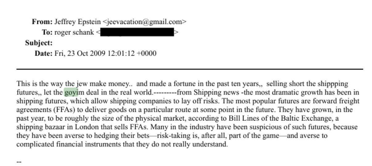 在 2009 年的一封电子邮件中,爱泼斯坦向犹太裔美国学者罗杰·沙坎表示了对非犹太人的轻蔑,并吹嘘自己通过金融投机获利,声称自己通过做空航运期货而取得成功,而“非犹太人”则要承担实体经济的风险。 “这就是犹太人赚钱的方式……在过去十年里他们赚得盆满钵满,通过做空航运期货,让那些外国人在现实世界中遭受损失。”