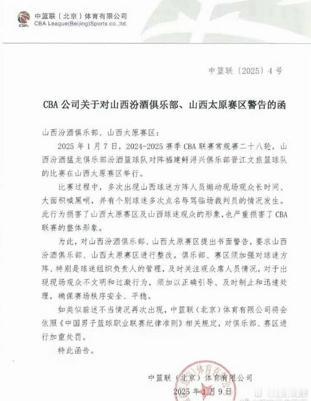 CBA公司曾在1月9号针对山西汾酒主场发函给予严重警告,要求太原赛区进行整改,正确引导及时制止现场球迷的不文明行为,并明确表示如果类似情况再出现必将加重处罚!而此次“吐痰门”事件,CBA官方也再次给予山西赛区20000元的重罚,并对因为被一口大痰吐在脸上的杰曼做出侮辱性手势的不当行为罚款3万。 CBA官方公布对山西北京的罚单