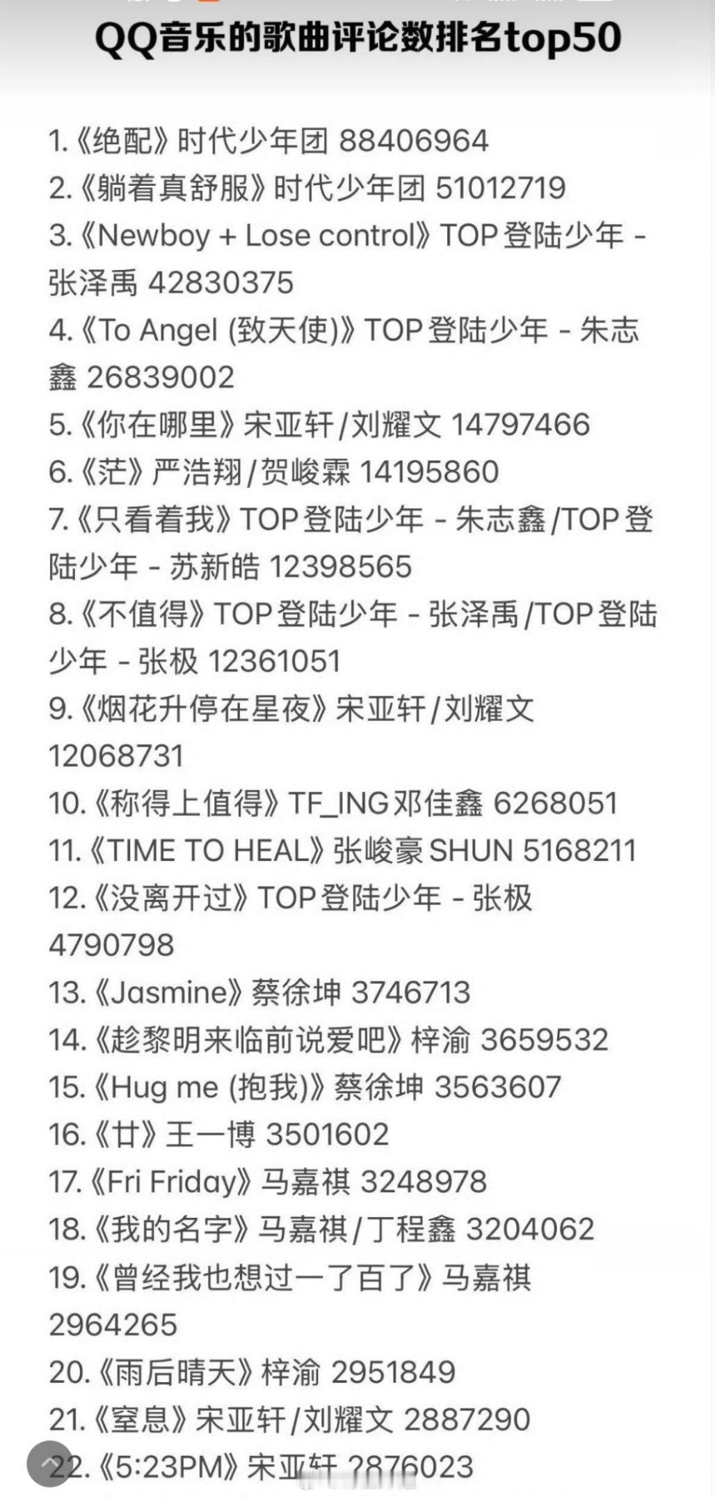 QQ音乐的歌曲评论数量排名在前50的排名来了,排名在第一的是时代少年团的歌曲,你