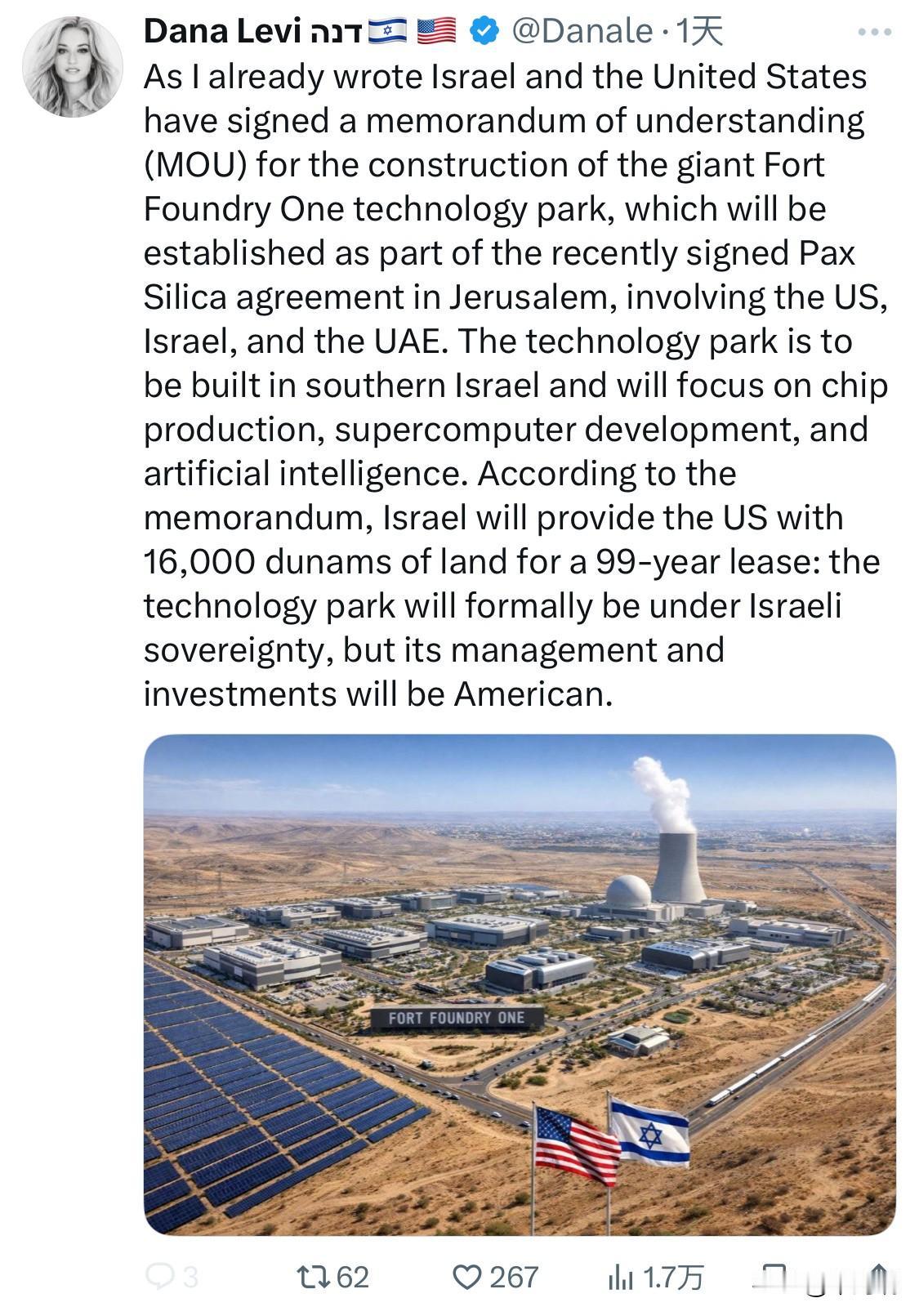根据最新消息,以色列与美国于 2026年1月16日 在耶路撒冷正式签署了相关的谅解备忘录。该协议是美国主导的全球AI供应链倡议 “硅和平” (Pax Silica) 计划的重要组成部分。 以下是关于该计划及“Fort Foundry One”科技园区的详细信息: 项目核心: “Fort Foundry One” 是一座计划建在以色列南部(内盖夫地区或加沙地带附近)的巨型工业园区。其核心目标是建立一个全球领先的芯片制造、超级计算机研发和人工智能中心。 土地与主权: 根据协议,以色列将向美国提供 16,000 杜纳姆(约合1,600公顷,1杜纳姆等于0.1公顷)的土地,租期为 99年。该地区在名义上仍属于以色列主权,但其管理和主要投资将由美国负责,美国科技公司将与以色列公司在此并肩工作。 “硅和平”计划 (Pax Silica): 该倡议由美国国务院发起,旨在通过联合日本、韩国、阿联酋、新加坡等盟友,重组全球半导体和AI供应链,减少对竞争对手(如中国)的依赖。 多边参与: 阿联酋和卡塔尔也已加入该框架。阿联酋近期还与美国达成协议,在阿布扎比建设占地10平方英里的AI校区,作为该战略的另一支柱。 基础设施支持: 园区预计将配备“高密度能源基础设施”,甚至可能包括核能设施,以满足数据中心庞大的电力需求。 相关事件信息: 名称: 硅和平峰会 (Pax Silica Summit) 签署日期: 2026年1月16日 签署地点: 耶路撒冷大卫城 (City of David) 关键签署人: 以色列国家AI总部负责人 Erez Askal 准将与美国负责经济事务的副国务卿 Jacob Helberg