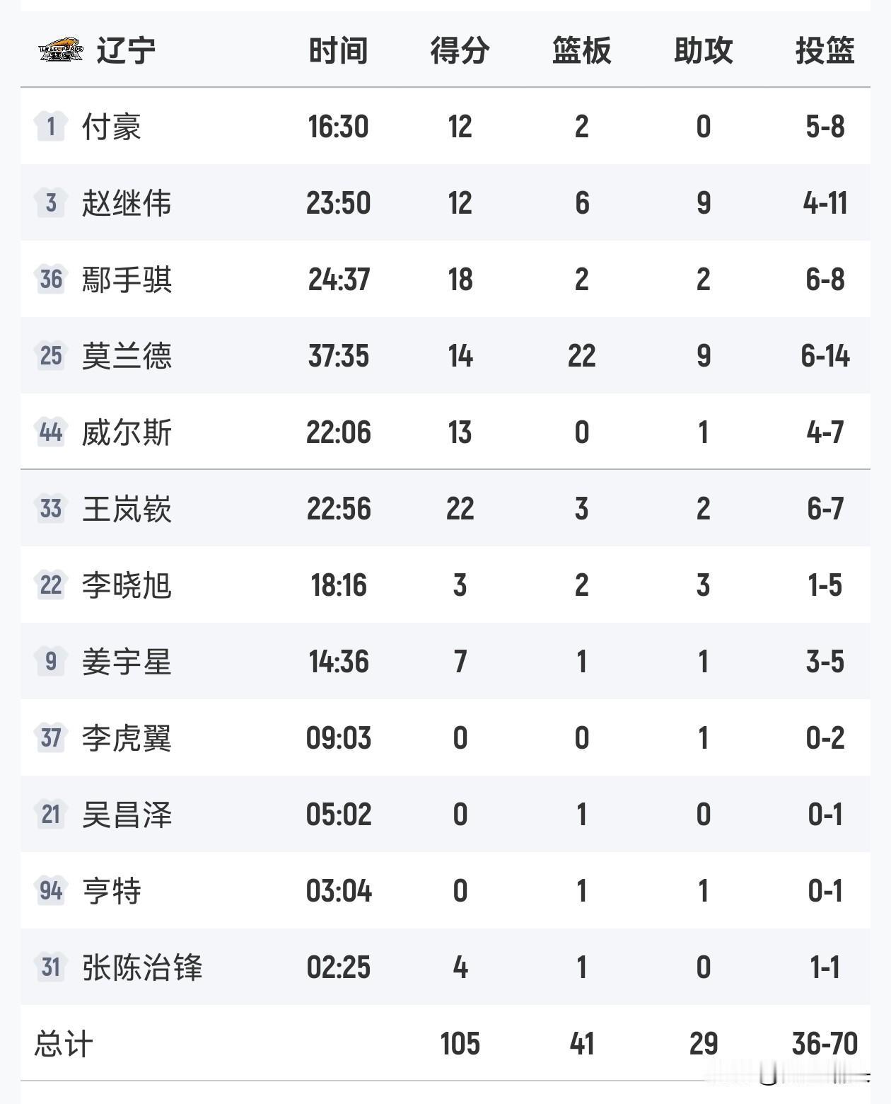 恭喜辽宁男篮取得了一场难得的胜利,在刚刚结束的CBA第22轮的比赛中,主场作战的辽宁男篮以105-91战胜了来访的天津男篮,辽宁男篮在上半场结束还落后天津男篮1分,下半场开始后辽宁男篮似乎找到了进攻的感觉,凭借单节33-16一举奠定了领先基础,本场比赛辽宁男篮本土球员依然发挥出色,贡献了78分外援贡献了27分,但是今天莫兰德的篮板球保护做的还是相当出色,全场贡献了22个篮板,本场比赛辽宁男篮12人轮换9人得分,其中6人得分上双,王岚嵚贡献了球队最高的22分2篮板3助攻,鄢手骐发挥同样出色贡献了18分2篮板2助攻,莫兰德14分22篮板9助攻的准三双数据,威尔斯13分,赵继伟,付豪均有12分入账,赵继伟还贡献了6篮板9助攻的数据,姜宇星7分张陈治锋4分,李晓旭3分,天津男篮外援哈姆雷特恭喜全场最高31分5篮板7助攻。