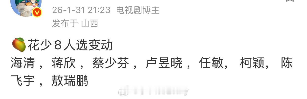 🍉花少8拟邀阵容变动海清 ,蒋欣 ,蔡少芬 ,卢昱晓 ,任敏, 柯颖, 陈飞宇 ,敖瑞鹏
