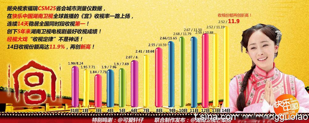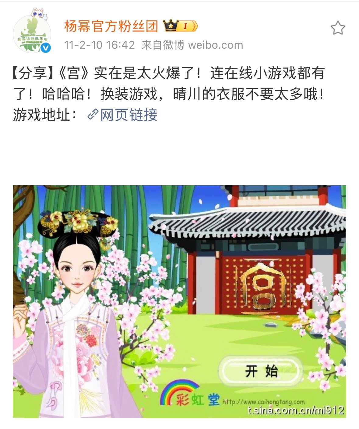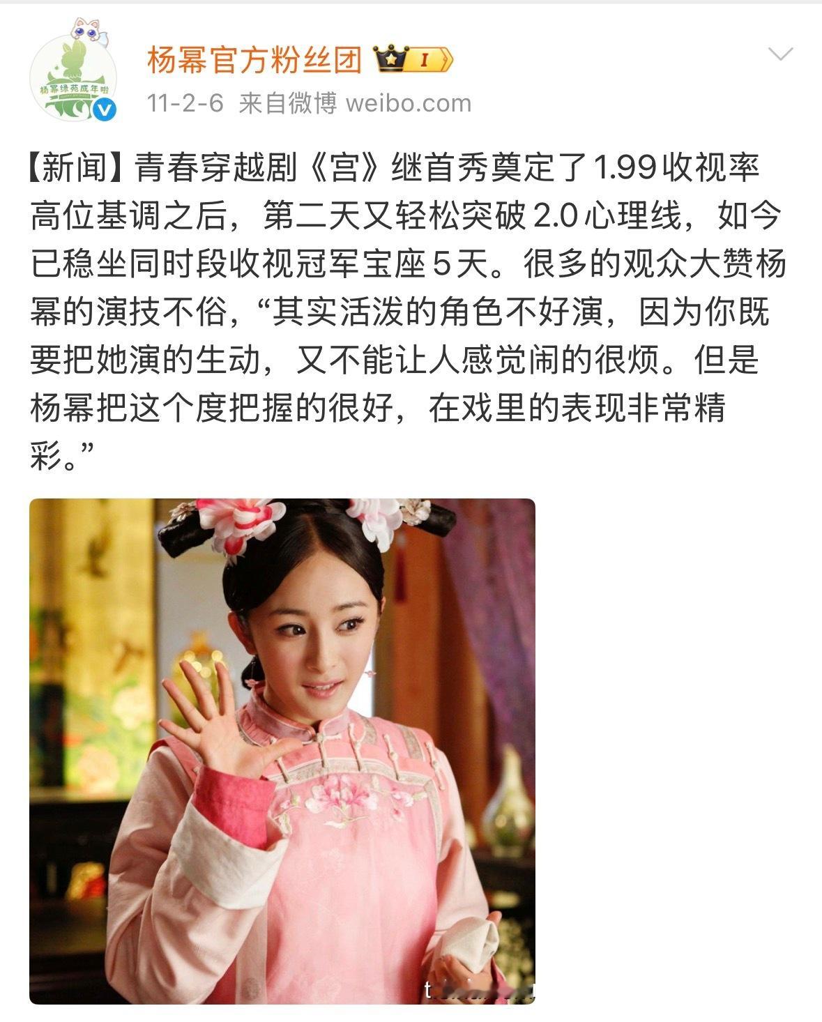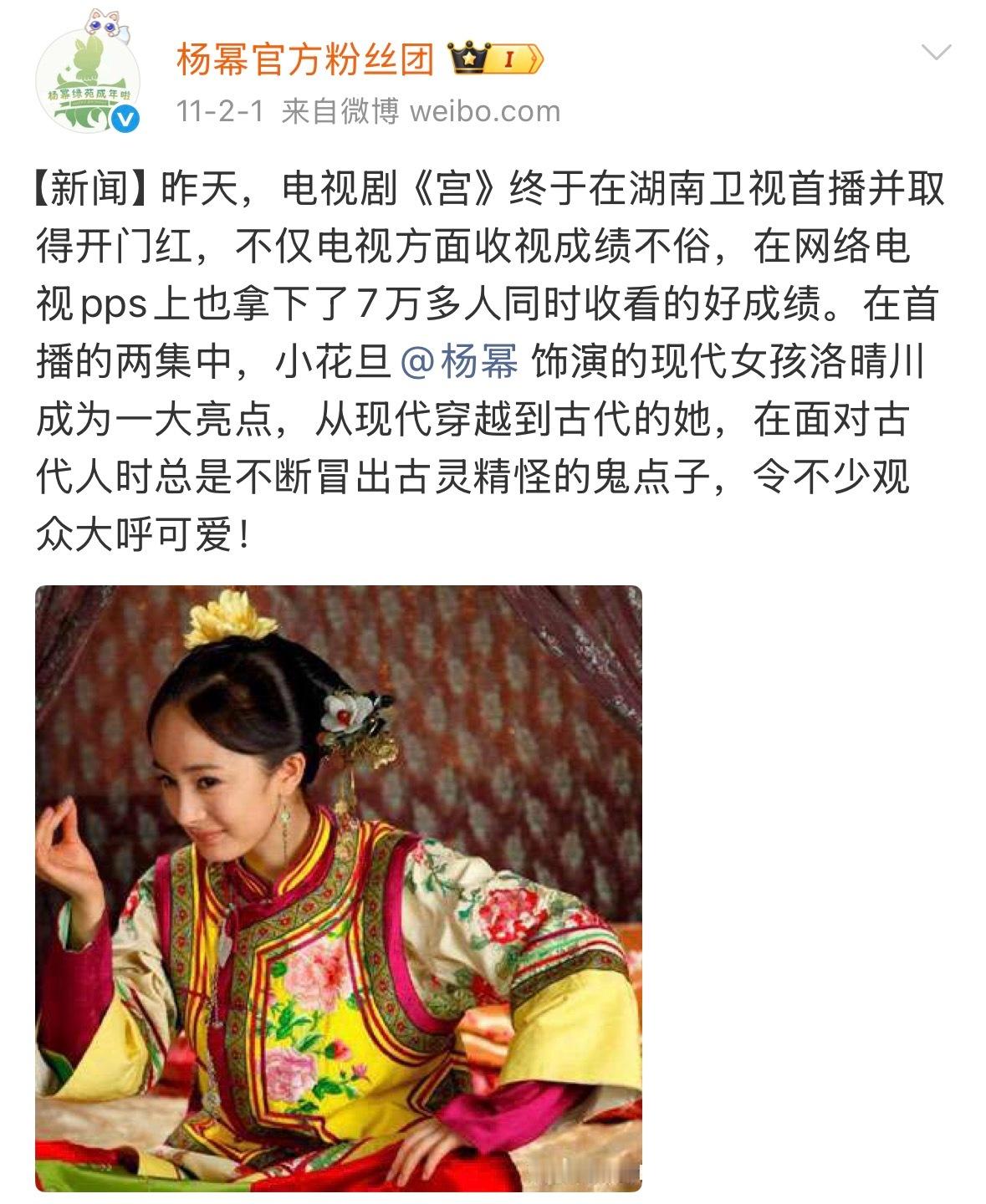 杨幂宫开播十五周年 2011年1月31日晚22点电视剧《宫(宫锁心玉)》在湖南卫视播出!15周年啦,多少人和我一样是梦开始的时候~刚考古了一下宫播出时候的盛况,晚10点开播首日即爆收视一路暴涨,首播杨幂演技备受观众好评,杨幂人气暴增粉丝飙增,宫上百度搜索榜第一,宫角色名晴川和昵称“香菇”上话题榜,还出了在线小游戏,主题曲爱的供养上新歌榜,杨幂上歌手榜,杨幂贴吧热门第一,杨幂官方粉丝团上榜,中国新闻社报道,台媒报道,杨幂采访接连不断被记者夸成熟心态好…… 考古到一些没怎么发过的实绩,在那个网络才刚刚兴起、视频网站才起步、短视频都没有的时代,宫和杨幂晴川的讨论度和传播度远远高于想象,造就现象级大爆剧大爆角色大爆演员,也是从那会开始杨幂的魅力深深吸引无数人